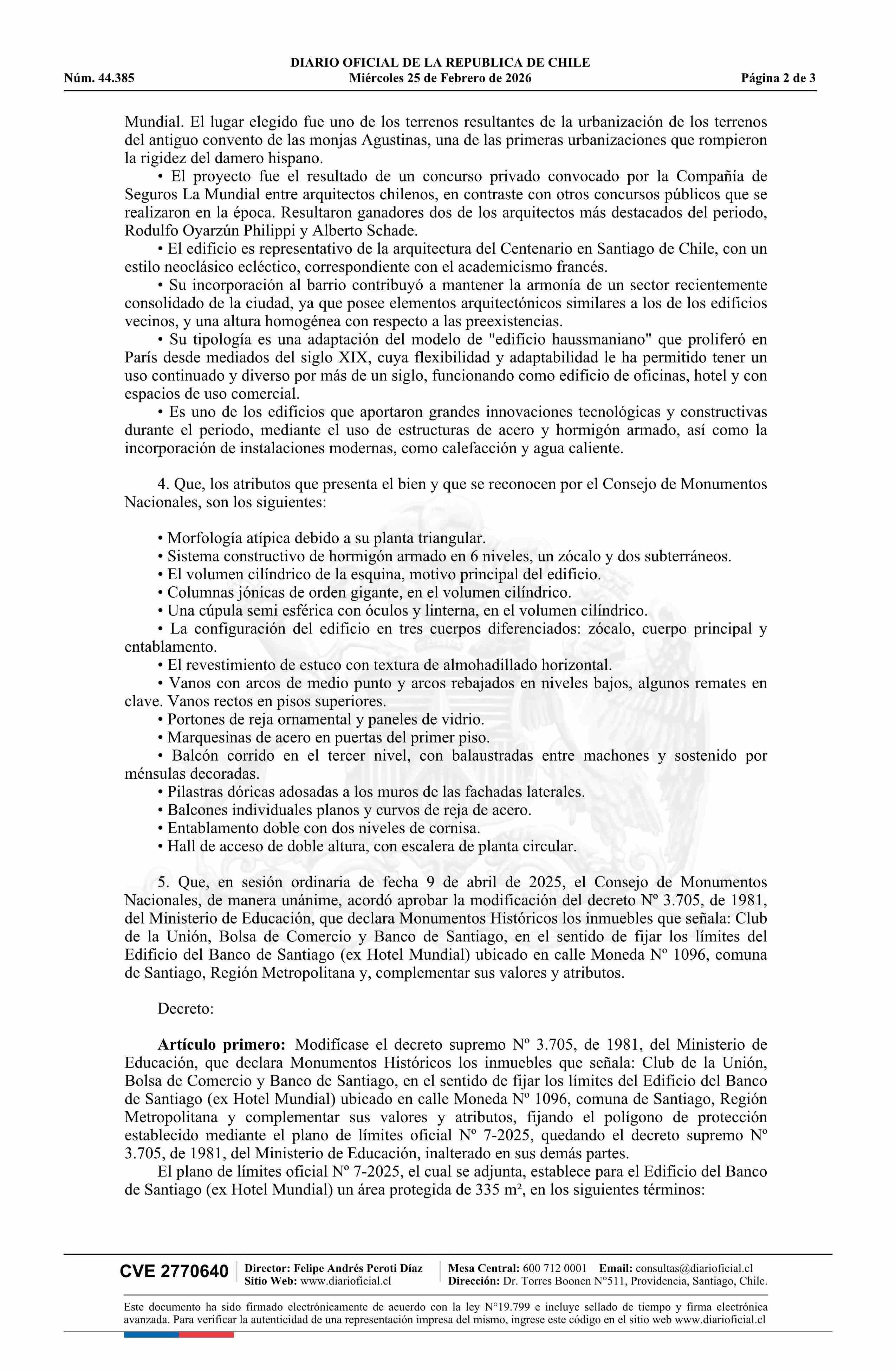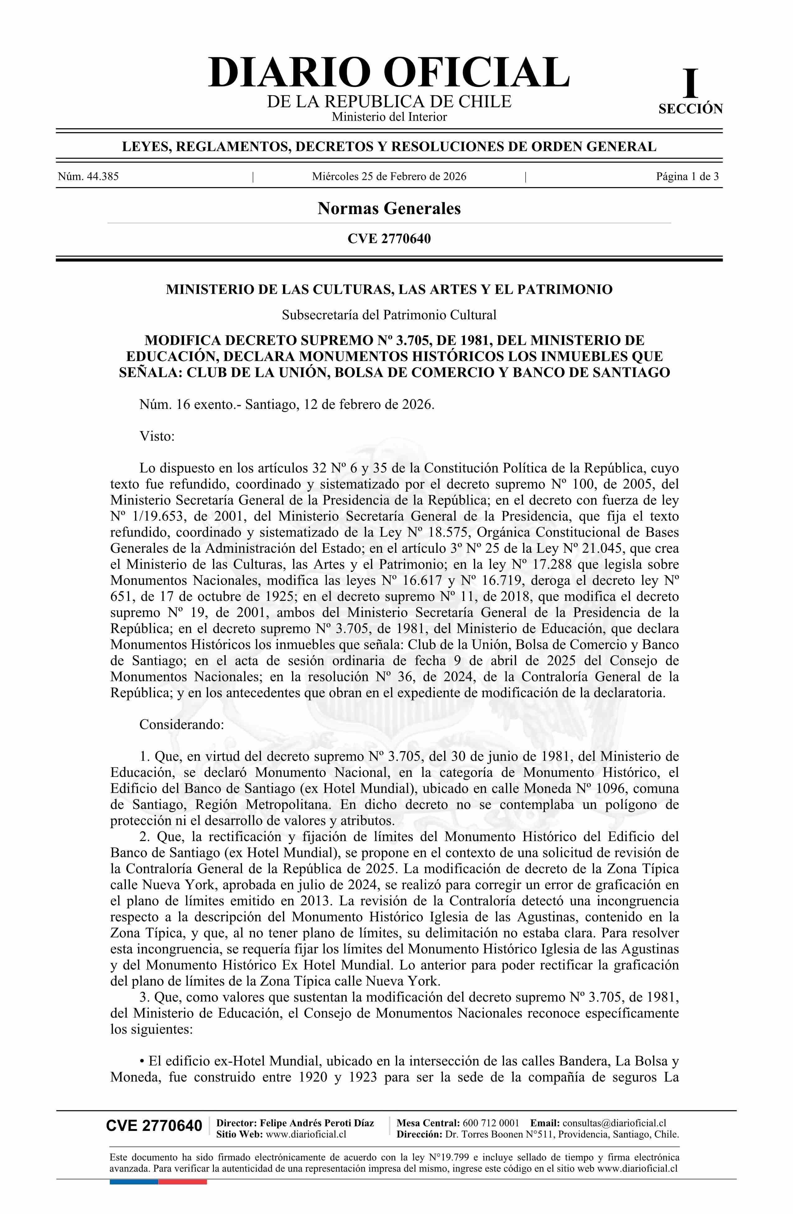 Título: Decreto exento número 16, de 2026.- Modifica decreto Nº 3.705, de 1981, del Ministerio de Educación, que declara Monumentos Históricos los inmuebles Club de la Unión, Bolsa de Comercio y Banco de Santiago