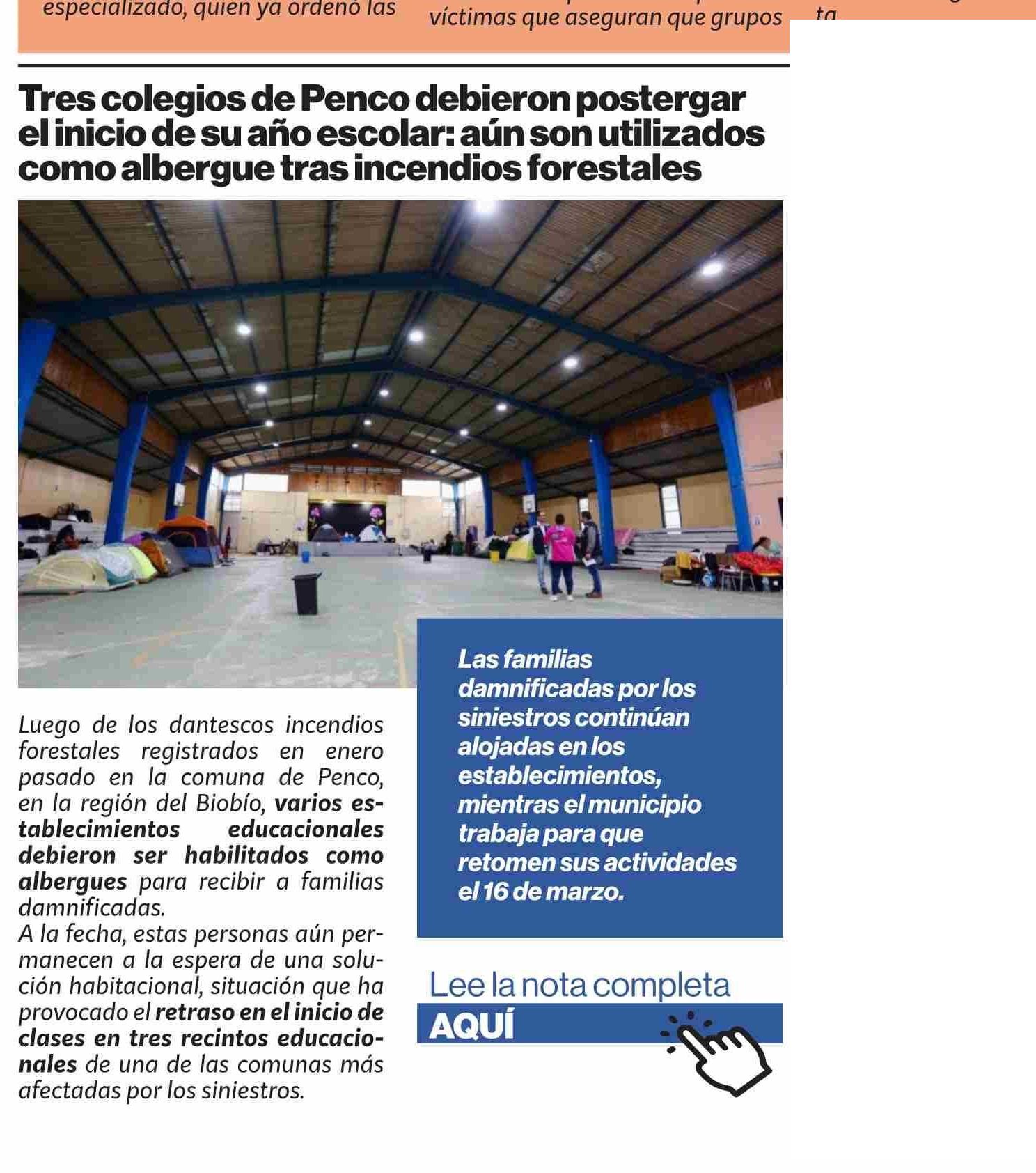 Tres colegios de Penco debieron postergar el inicio de su año escolar: aún son utilizados como albergue trasincendios forestales