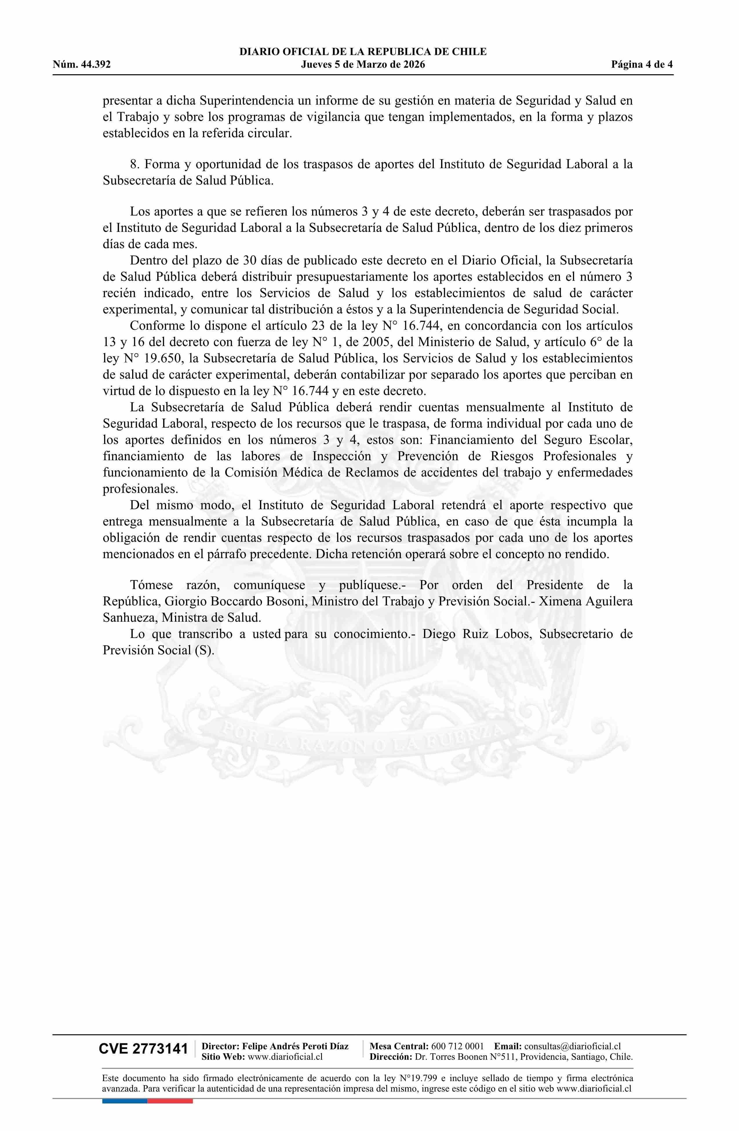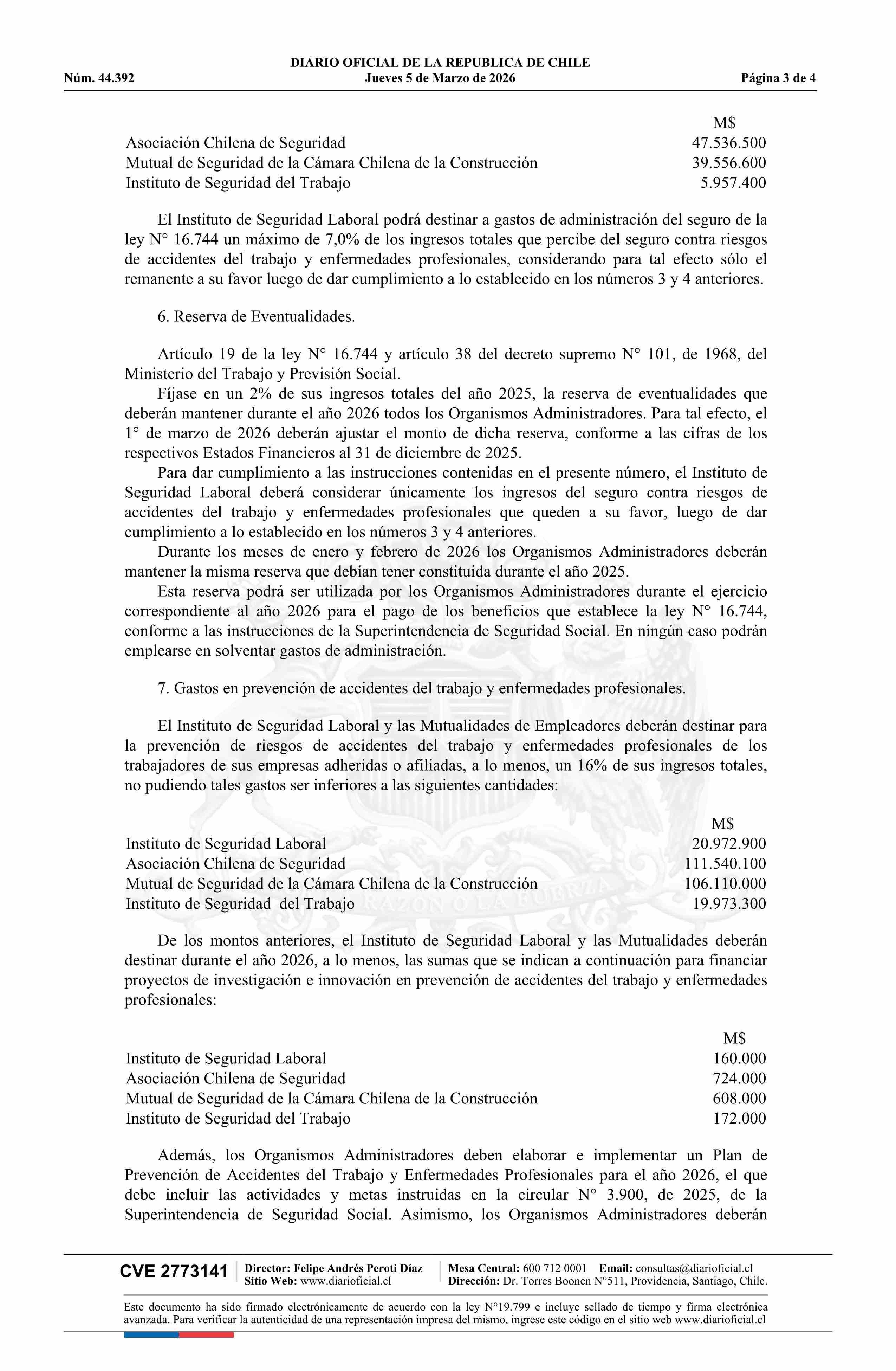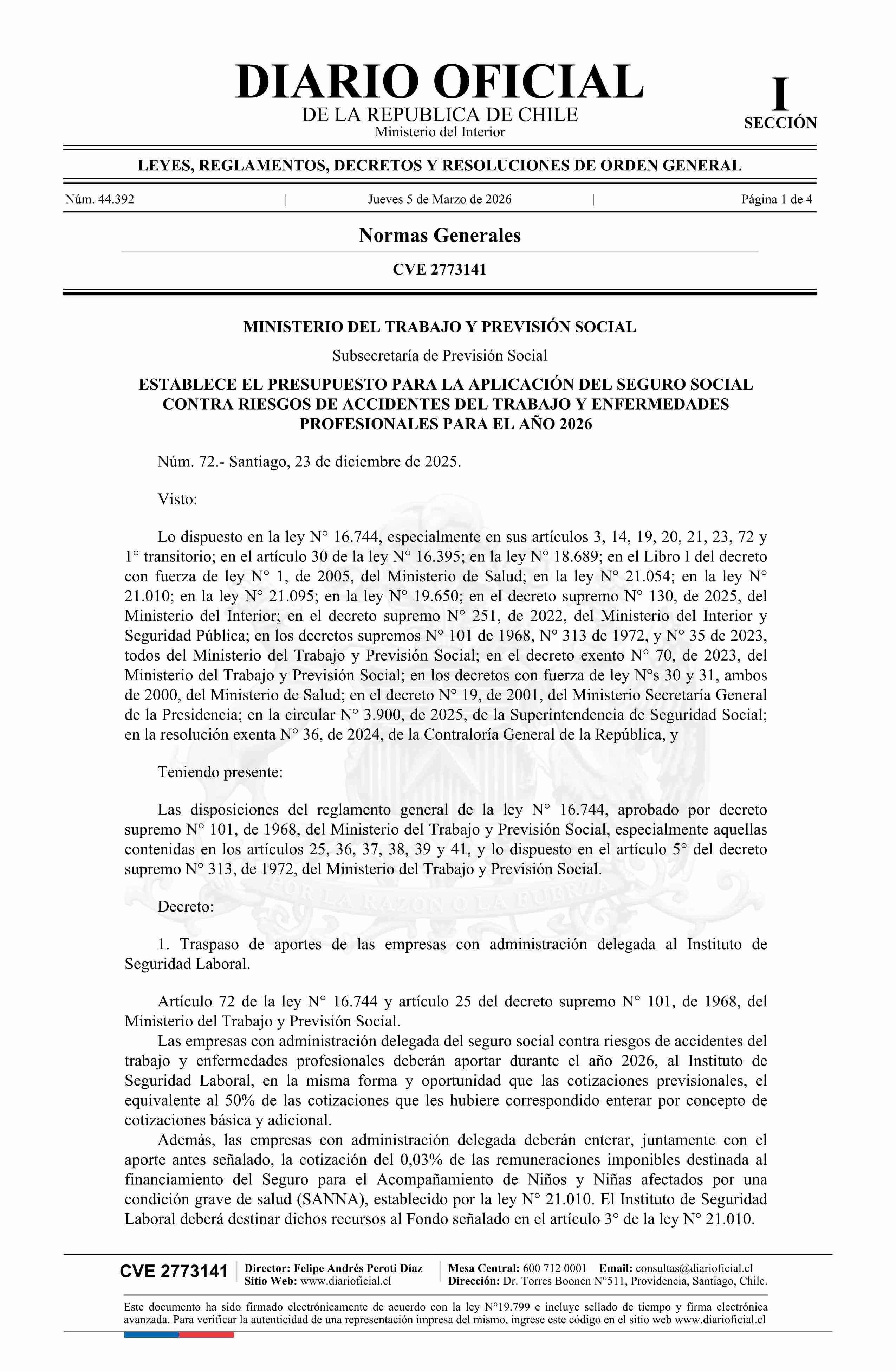 | Título: | Decreto número 72, de 2025.- Establece el presupuesto para la aplicación del seguro social contra riesgos de accidentes del trabajo y enfermedades profesionales para el año 2026 |