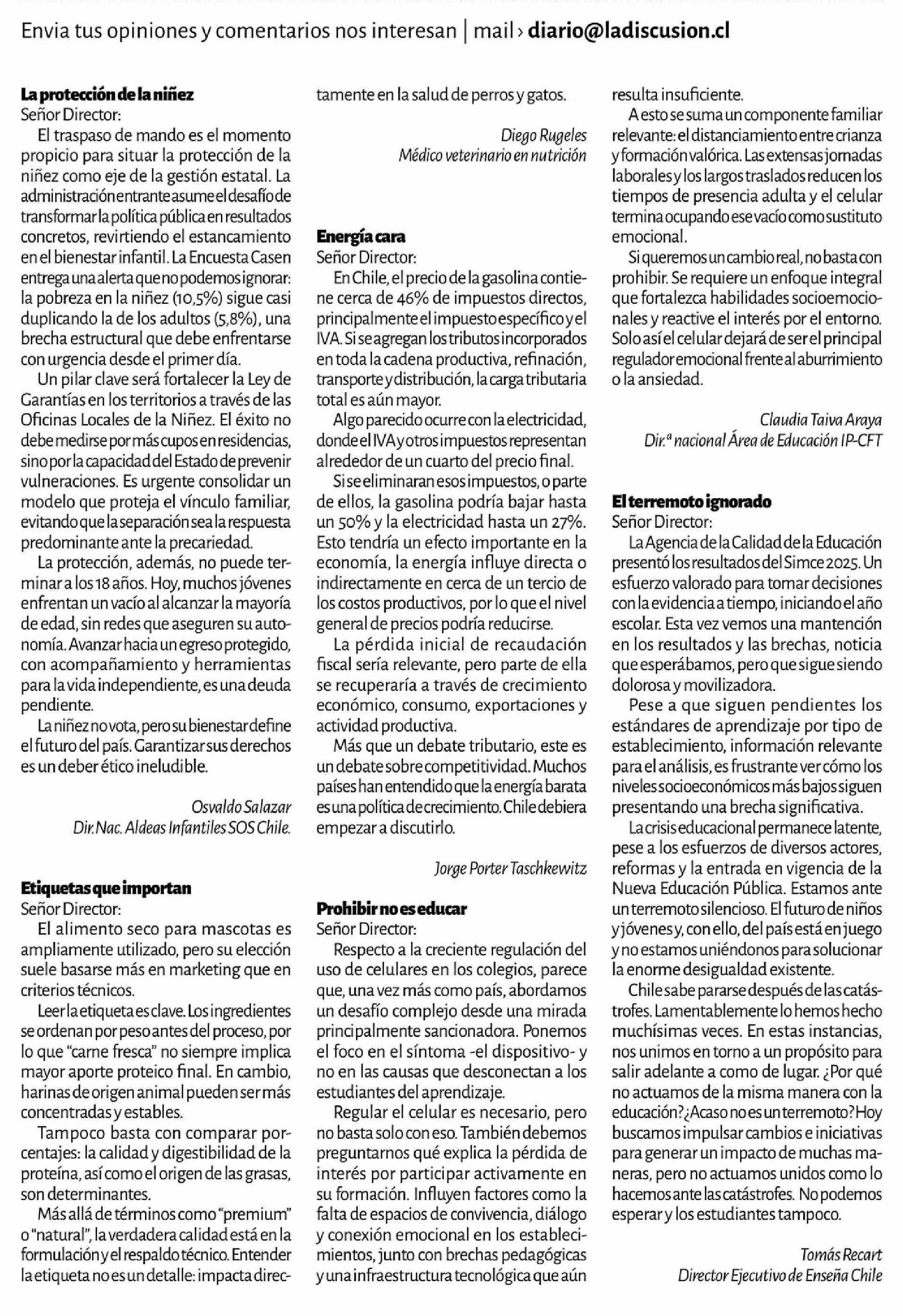 Título: Cartas: La protección de la niñez Señor Director: El traspaso de mando es el momento propicio para situar la protección de la niñez como eje de la gestión estatal. La administración entrante asume el desafío de transformar la política pública en resultados concretos, revirtiendo el estancamiento en