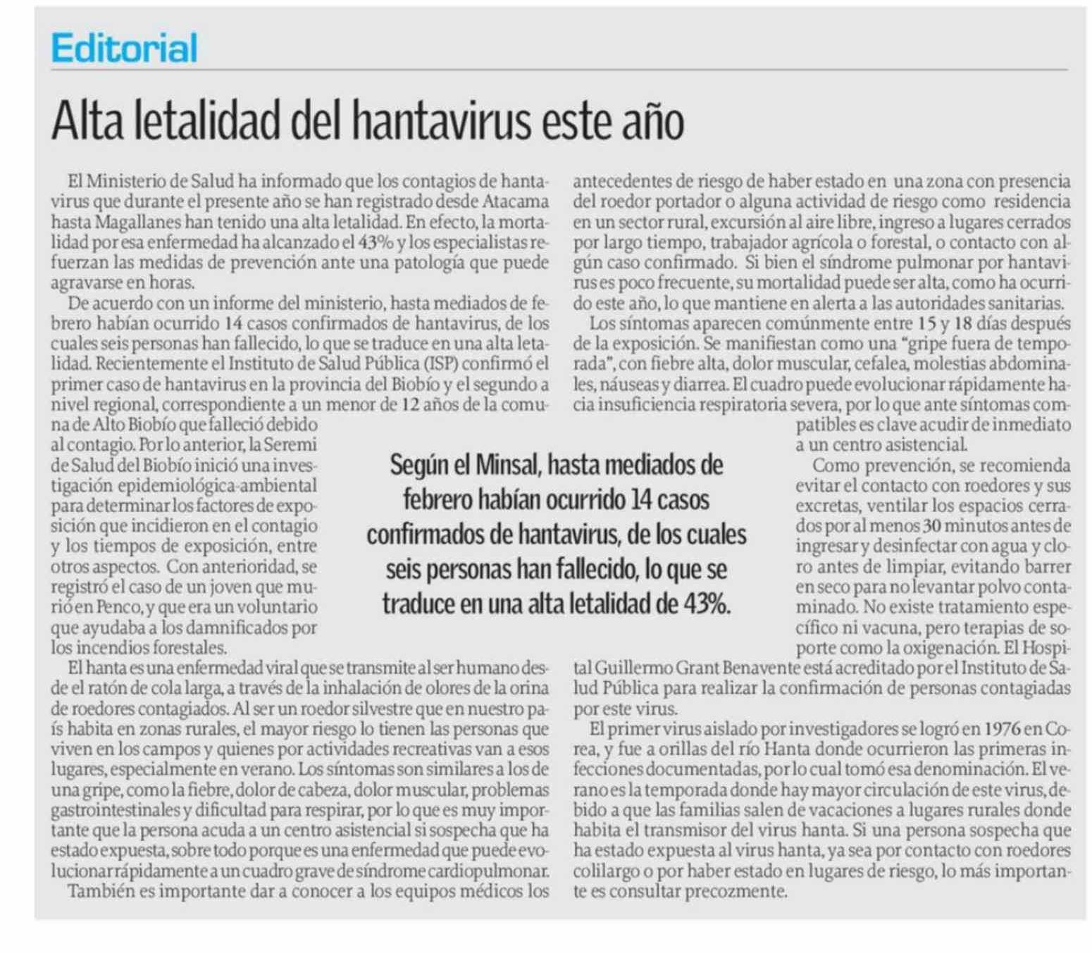EDITORIAL: Editorial Alta letalidad del hantavirus este año