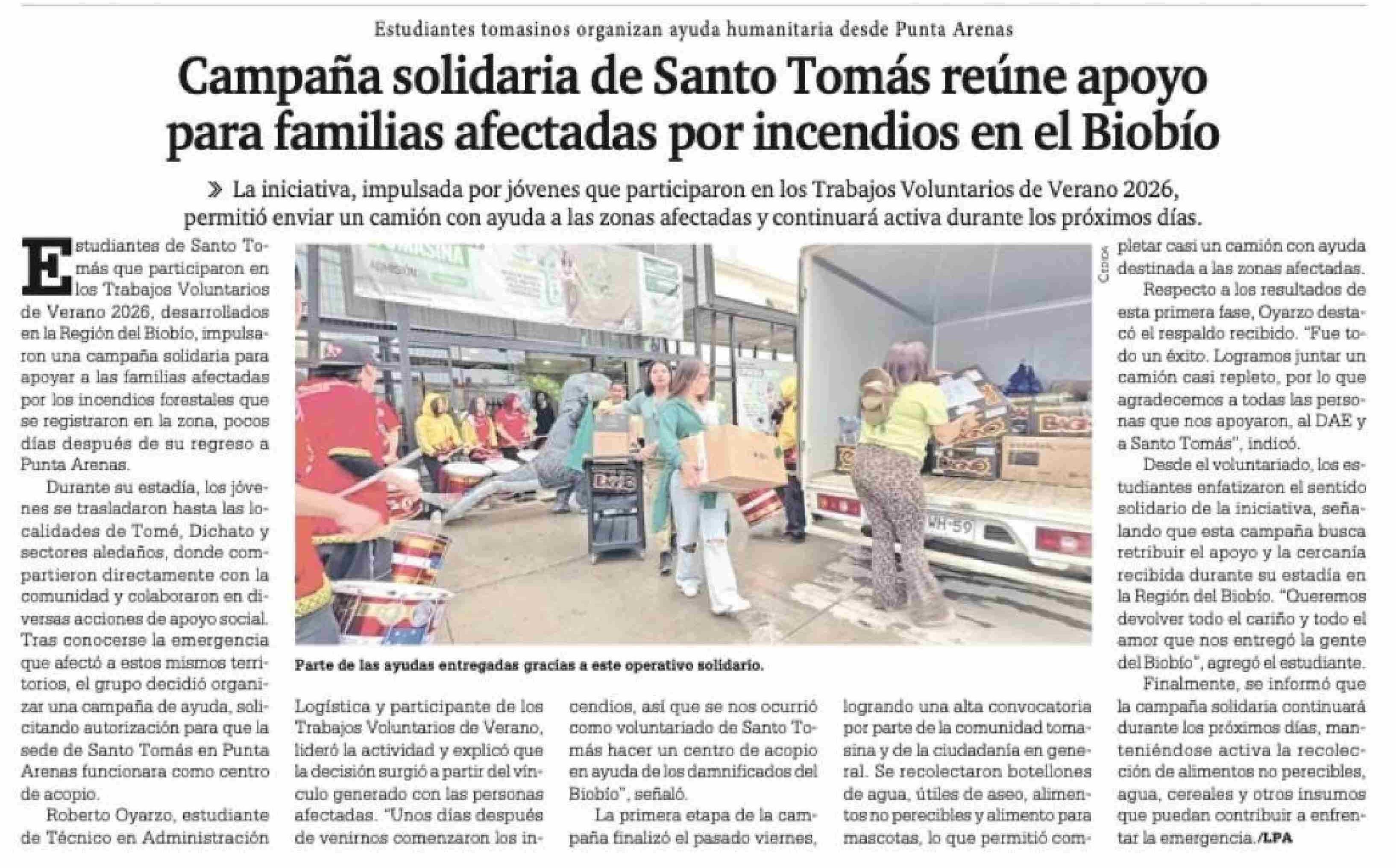 Campaña solidaria de Santo Tomás reúne apoyo para familias afectadas por incendios en el Biobío