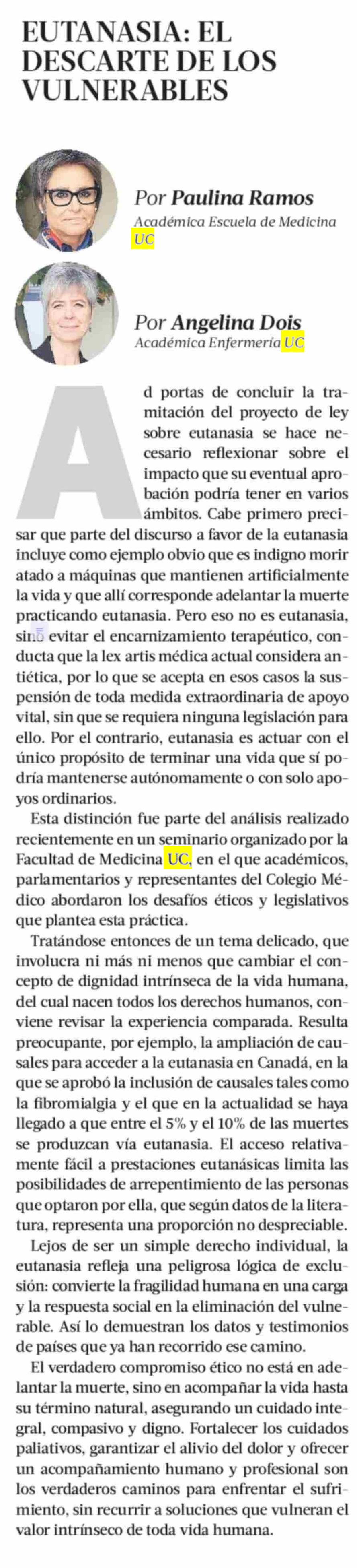 Columnas de Opinión: EUTANASIA: EL DESCARTE DE LOS VULNERABLES