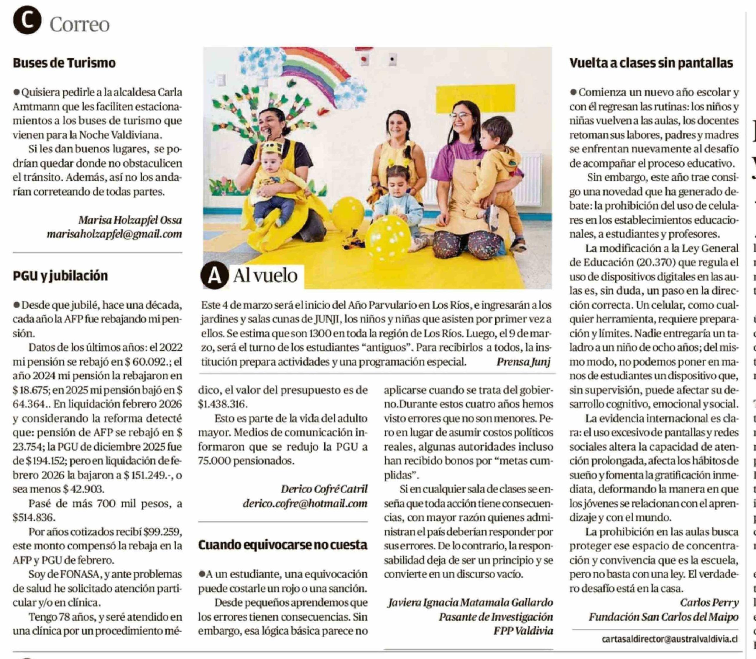 Título: Cartas: · Desde que jubilé, hace una década, cada año la AFP fue rebajando mi pensión. Datos de los últimos años: el 2022 mi pensión se rebajó en $ 60.092 .; el año 2024 mi pensión la rebajaron en $ 18.675; en 2025 mi pensión bajó en $ 64.364 .. En liquidación febrero 2026 y considerando la reforma