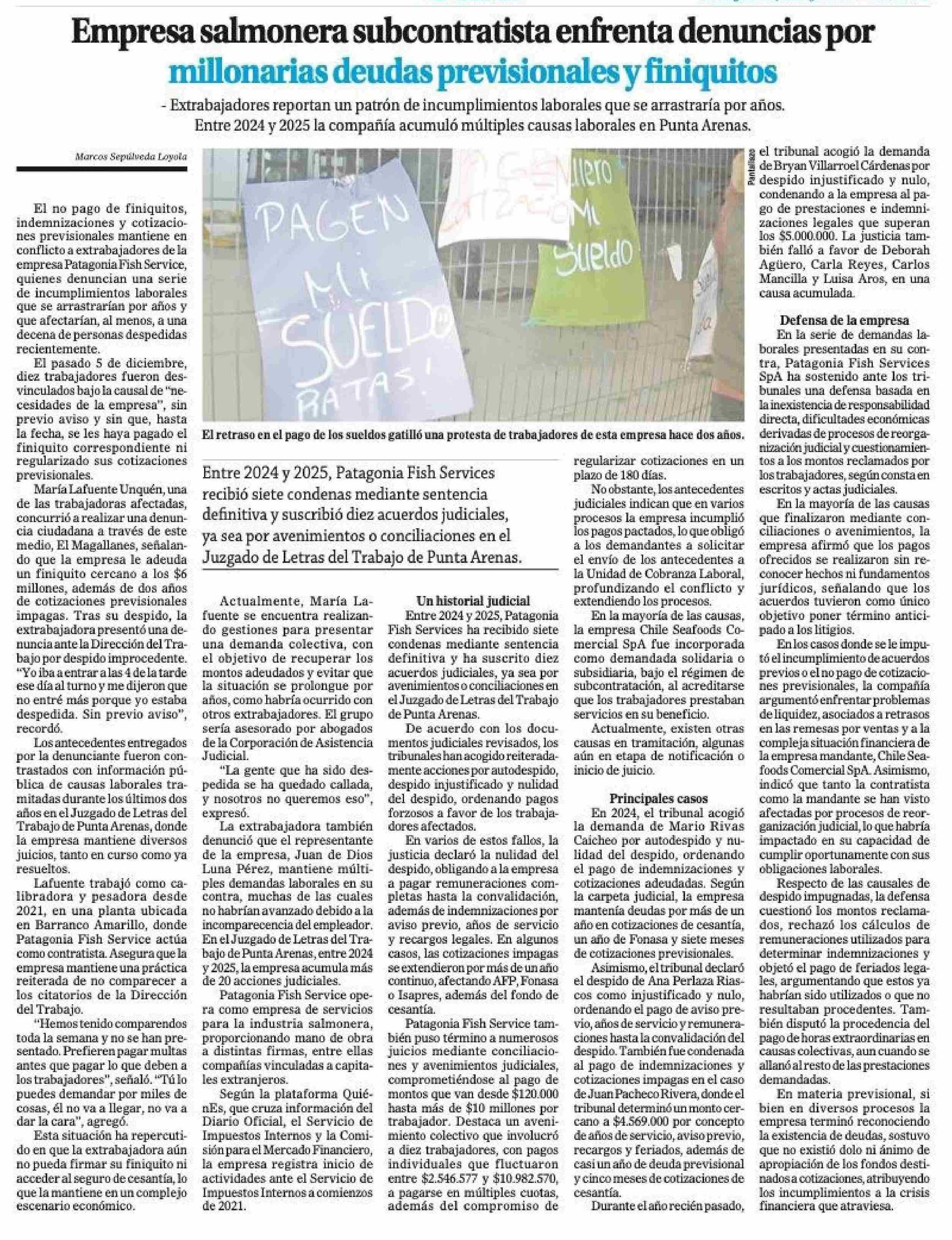 Empresa salmonera subcontratista enfrenta denuncias por millonarias deudas previsionales y finiquitos