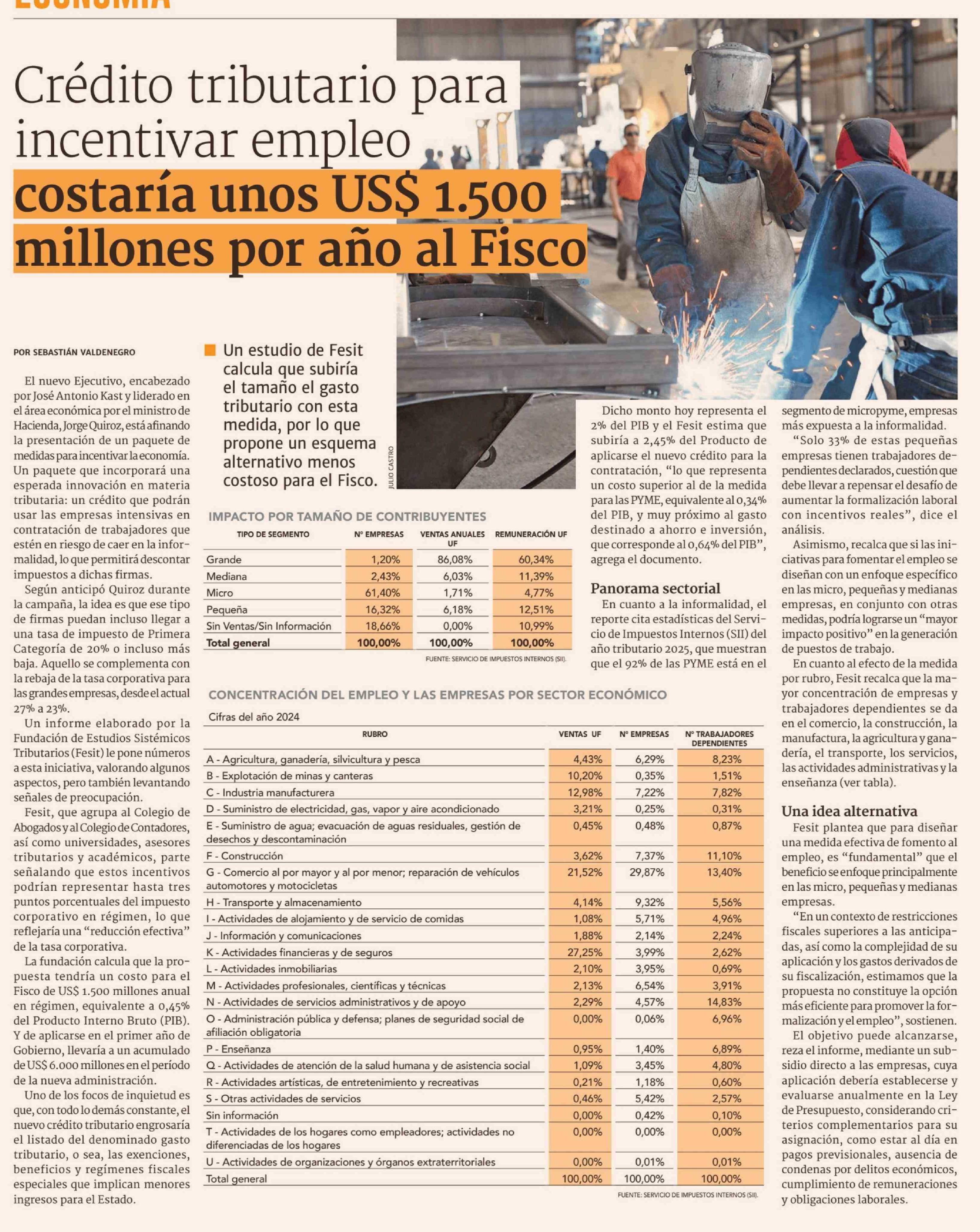 Crédito tributario para incentivar empleo costaría unos US$ 1.500 millones por año al Fisco