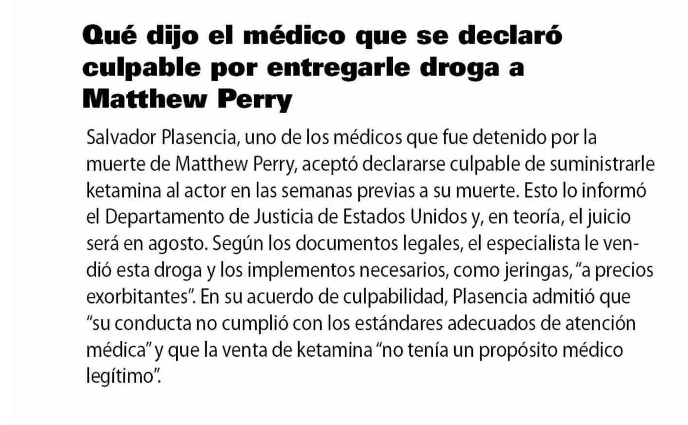 Qué dijo el médico que se declaró culpable por entregarle droga a Matthew Perry