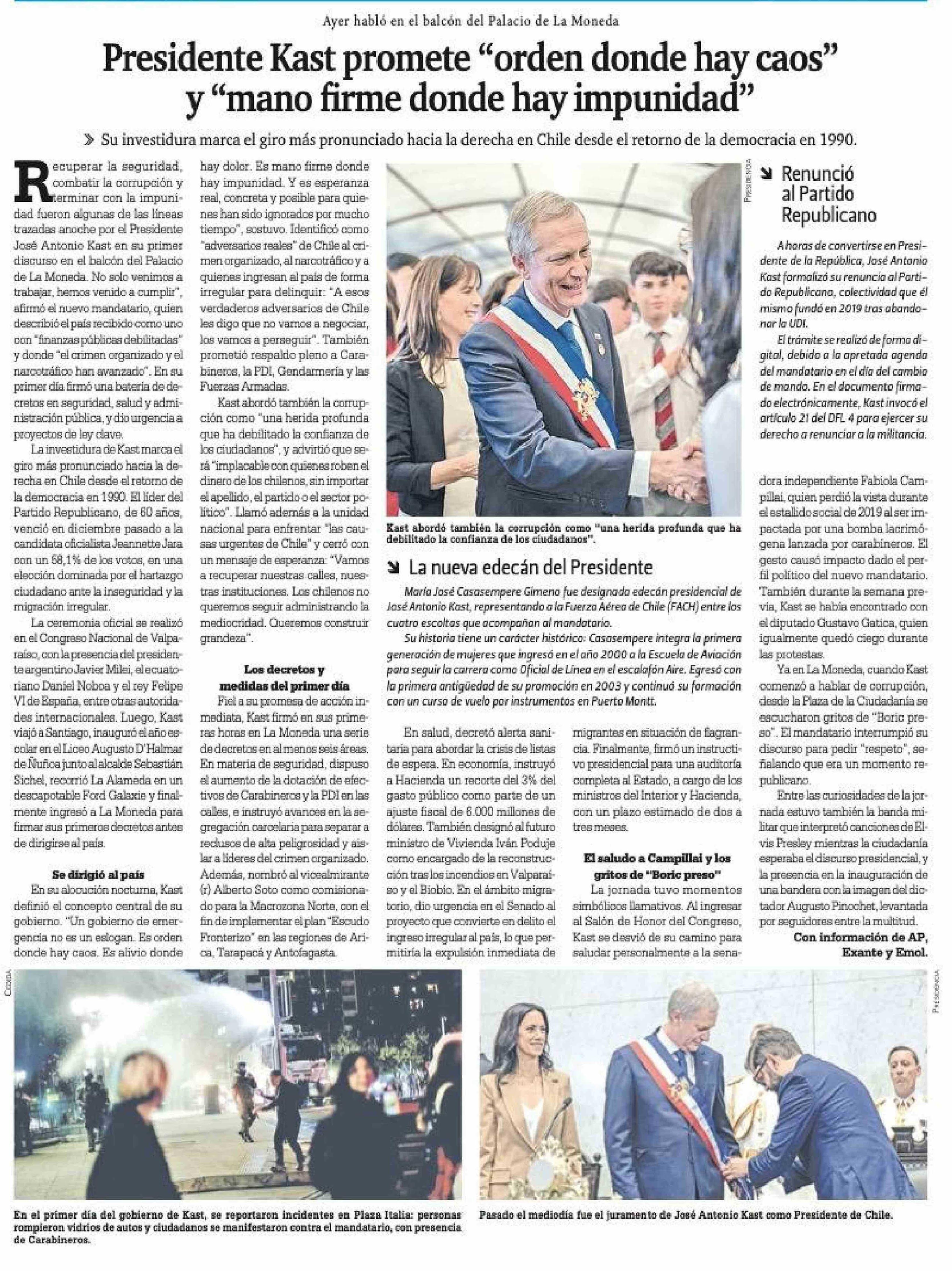 Presidente Kast promete "orden donde hay caos" y "mano firme donde hay impunidad"