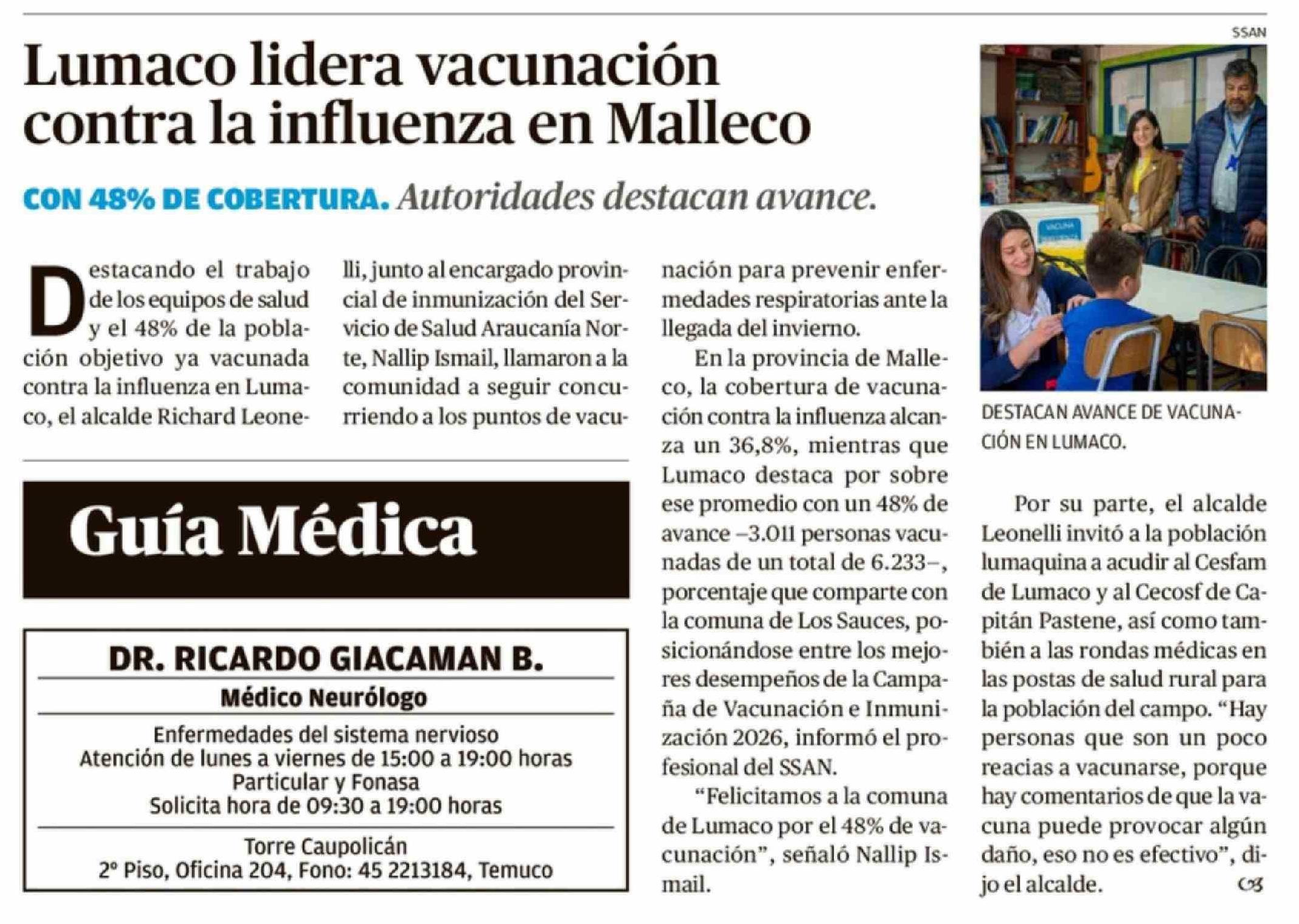 Lumaco lidera vacunación contra la influenza en Malleco