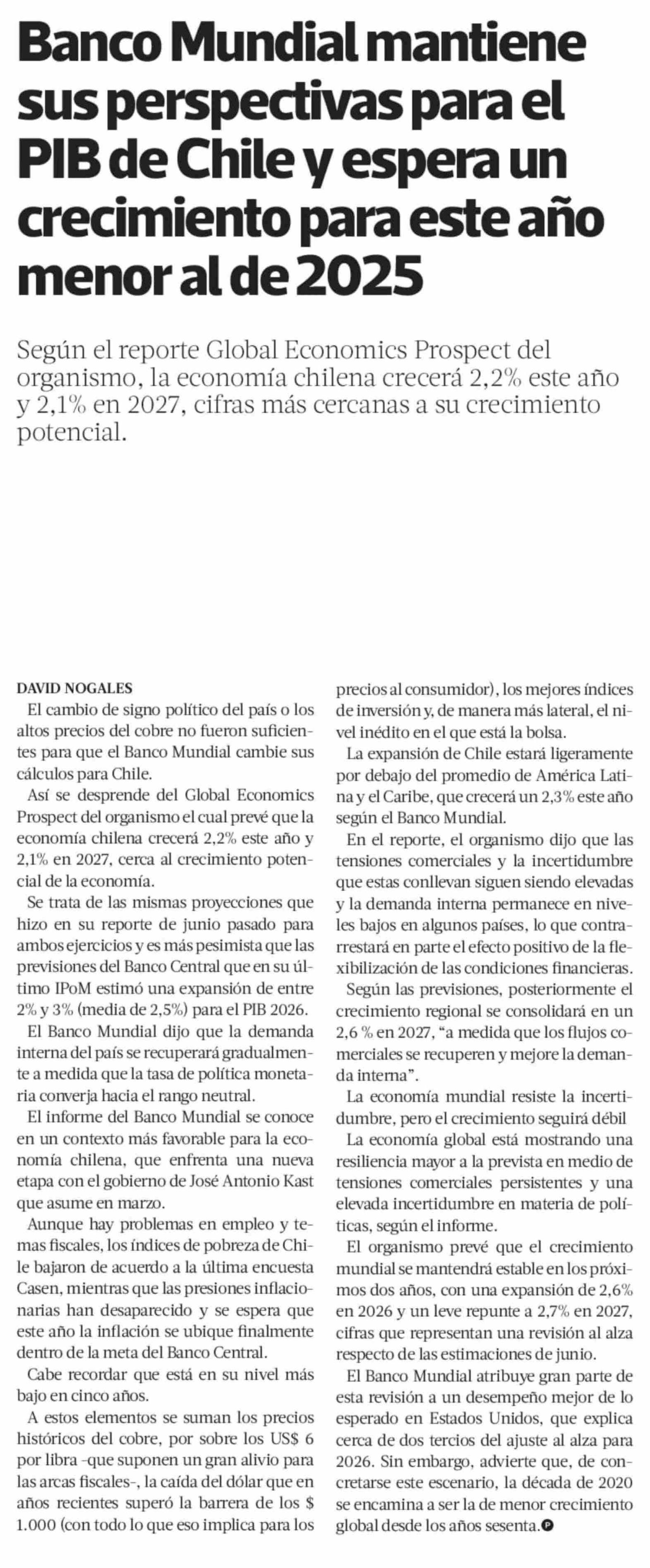 Banco Mundial mantiene sus perspectivas para el PIB de Chile y espera un crecimiento para este año menor al de 2025