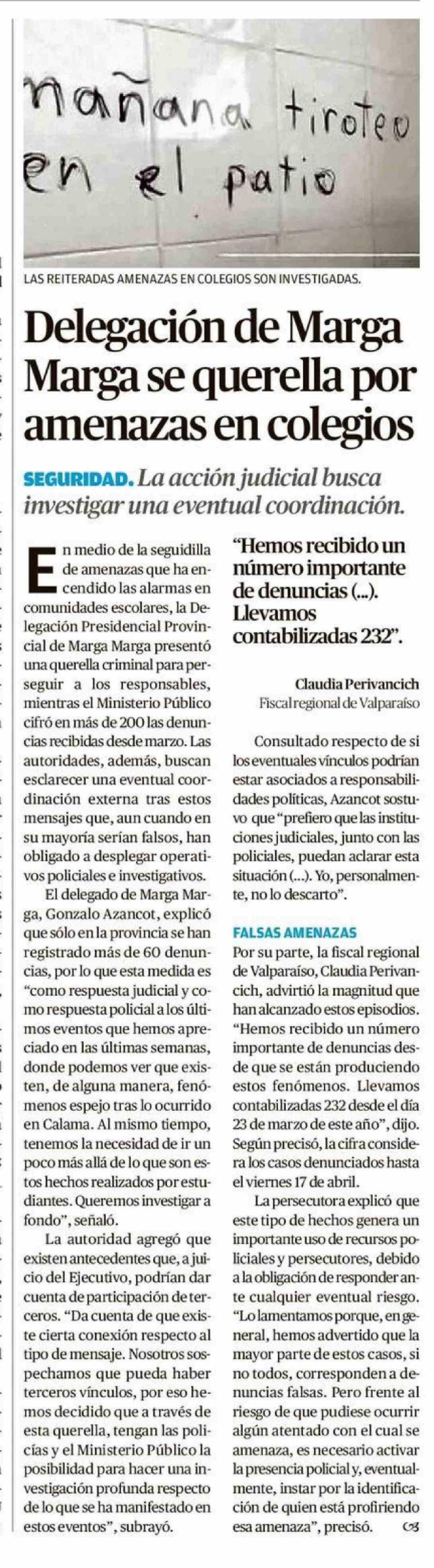 Delegación de Marga Marga se querella por amenazas en colegios