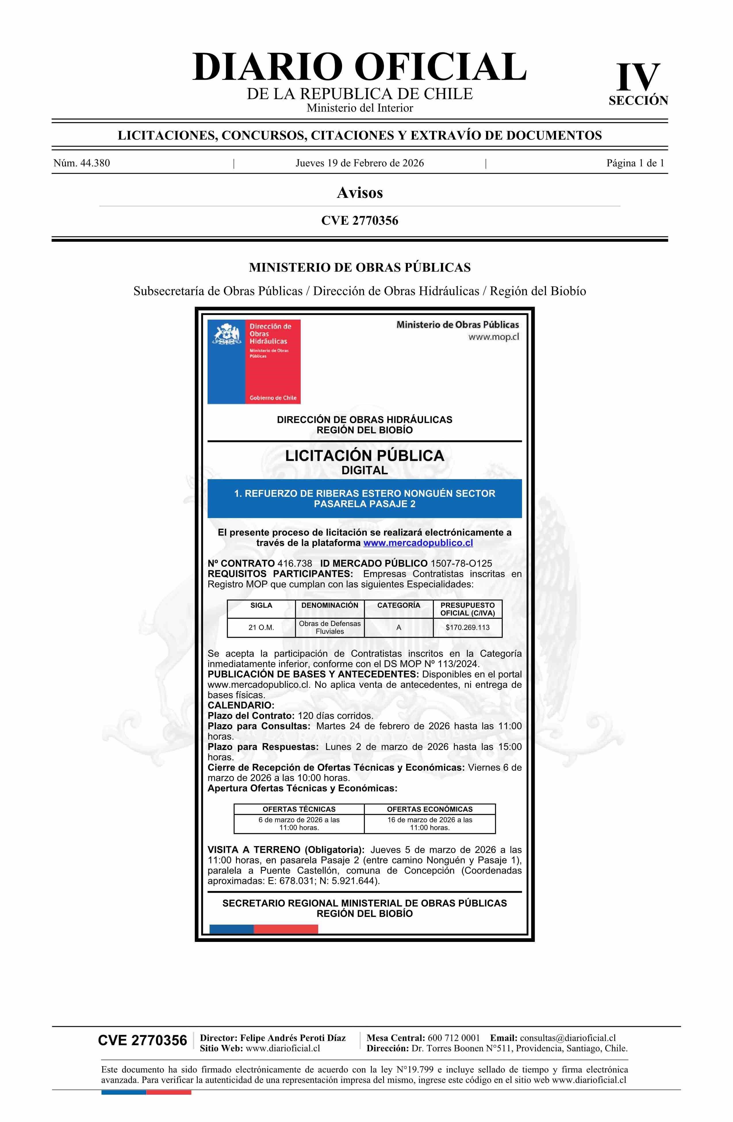 AVISO LICITACIONES: 1. Refuerzo de Riberas Estero Nonguén Sector Pasarela Pasaje 2