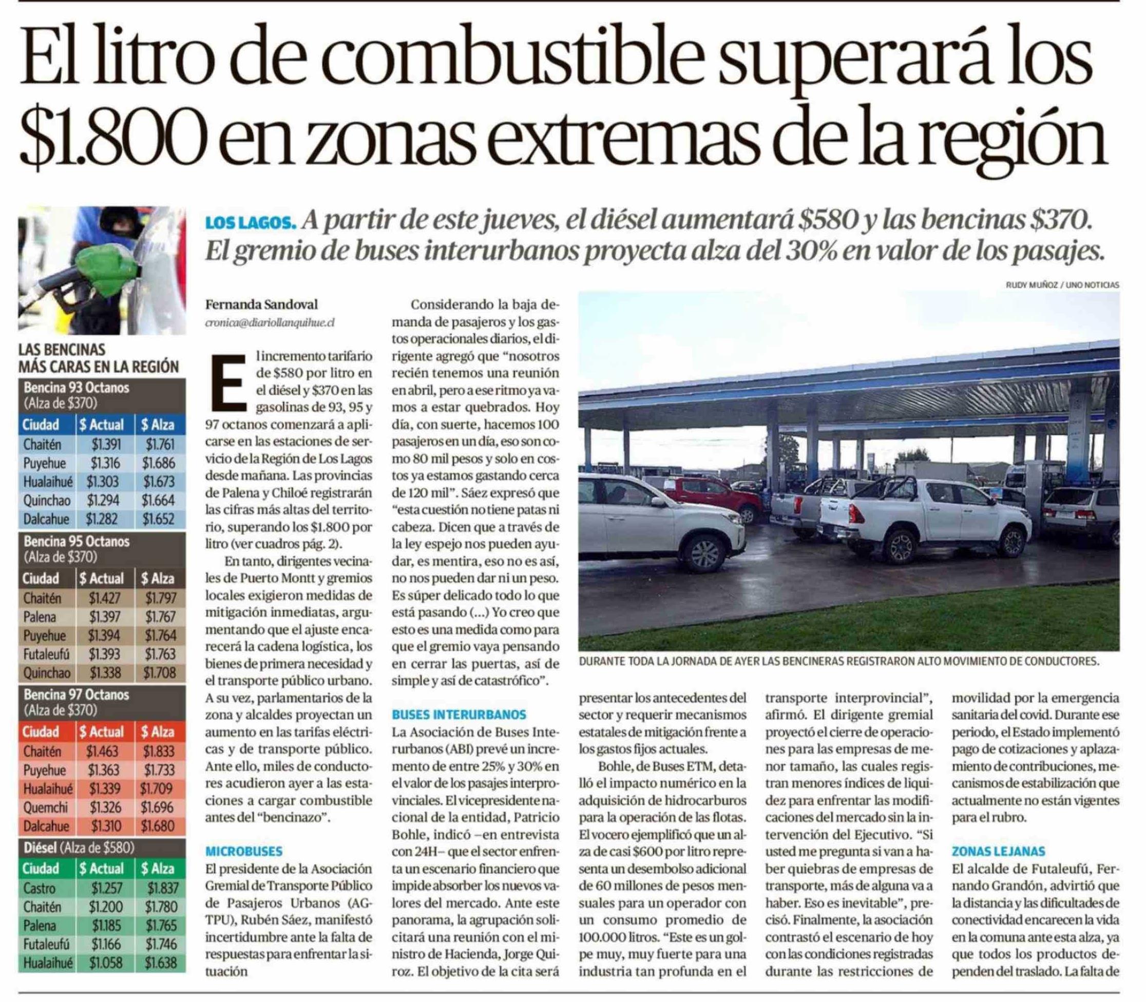 El litro de combustible superará los $1.800 en zonas extremas de la región