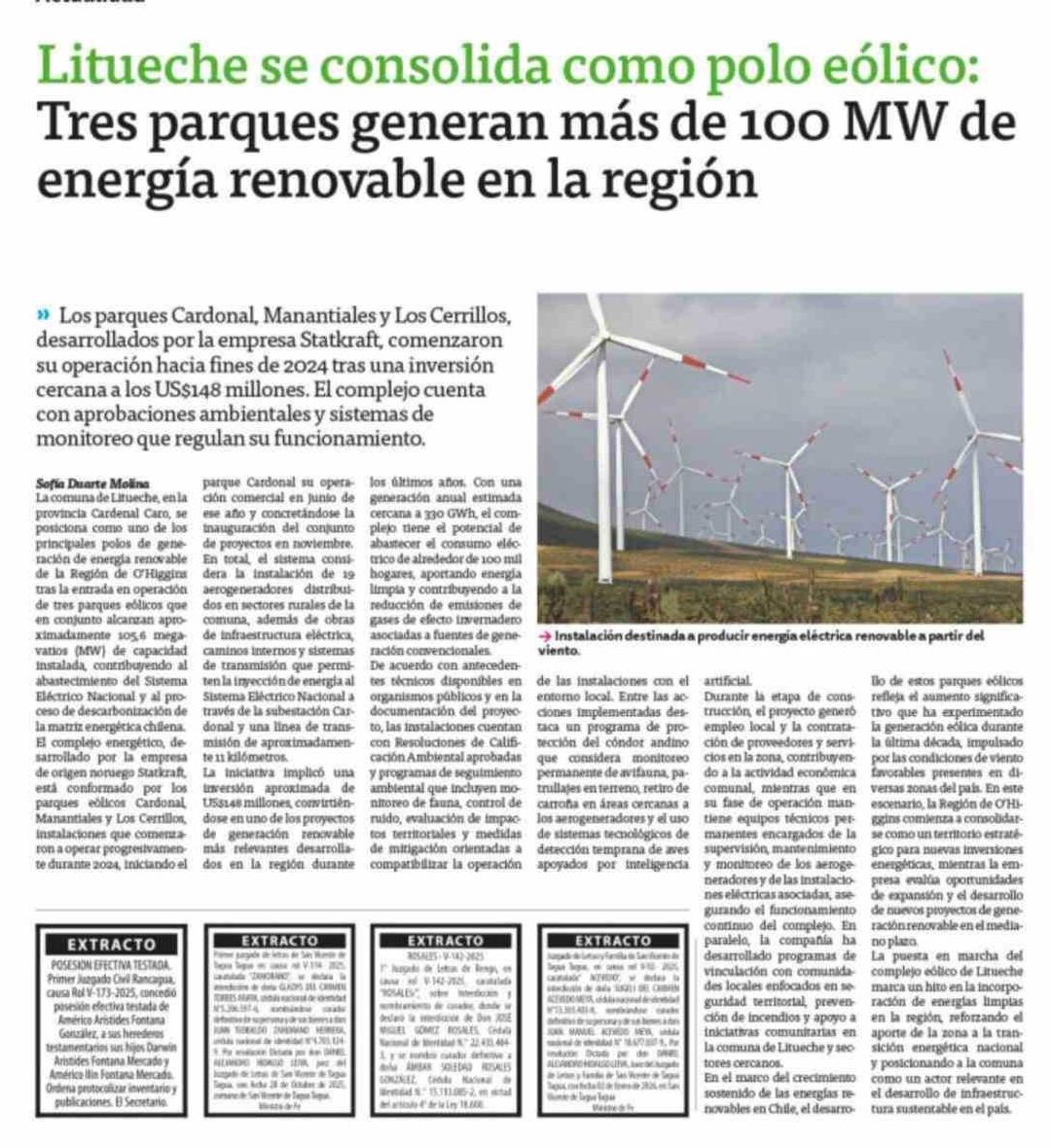 Litueche se consolida como polo eólico: Tres parques generan más de 100 MW de energía renovable en la región