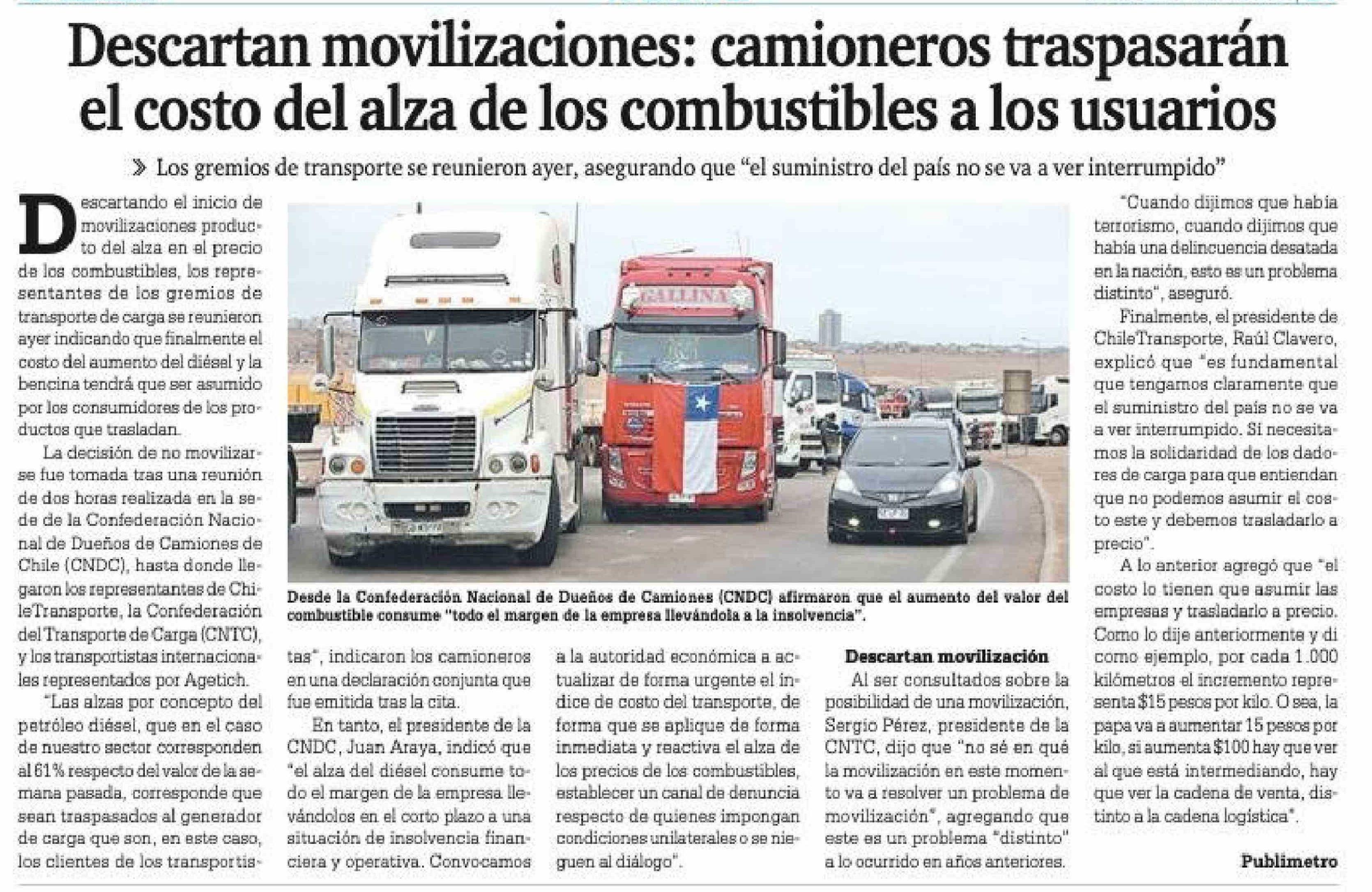 Descartan movilizaciones: camioneros traspasarán el costo del alza de los combustibles a los usuarios