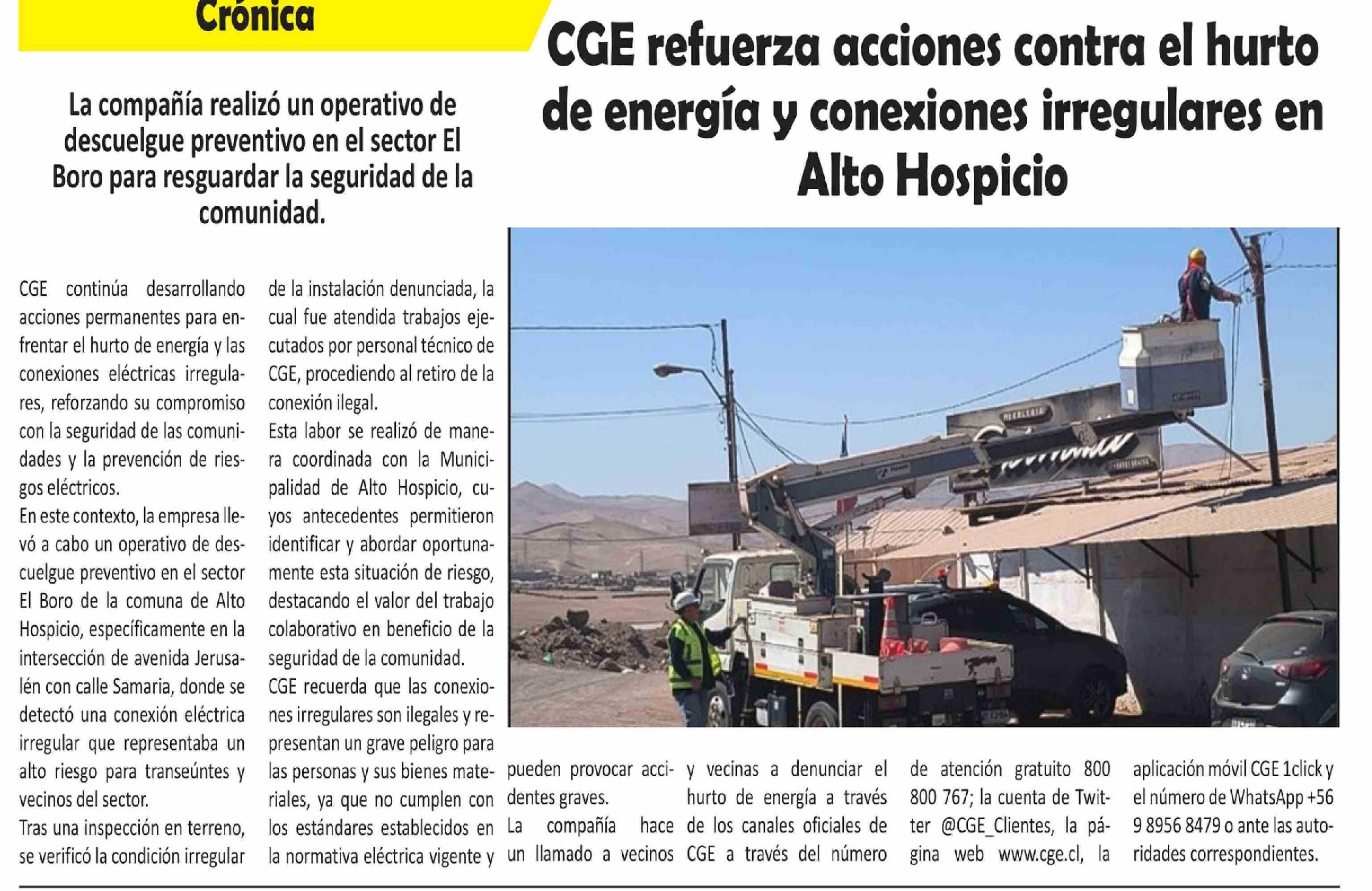 CGE refuerza acciones contra el hurto de energía y conexiones irregulares en Alto Hospicio