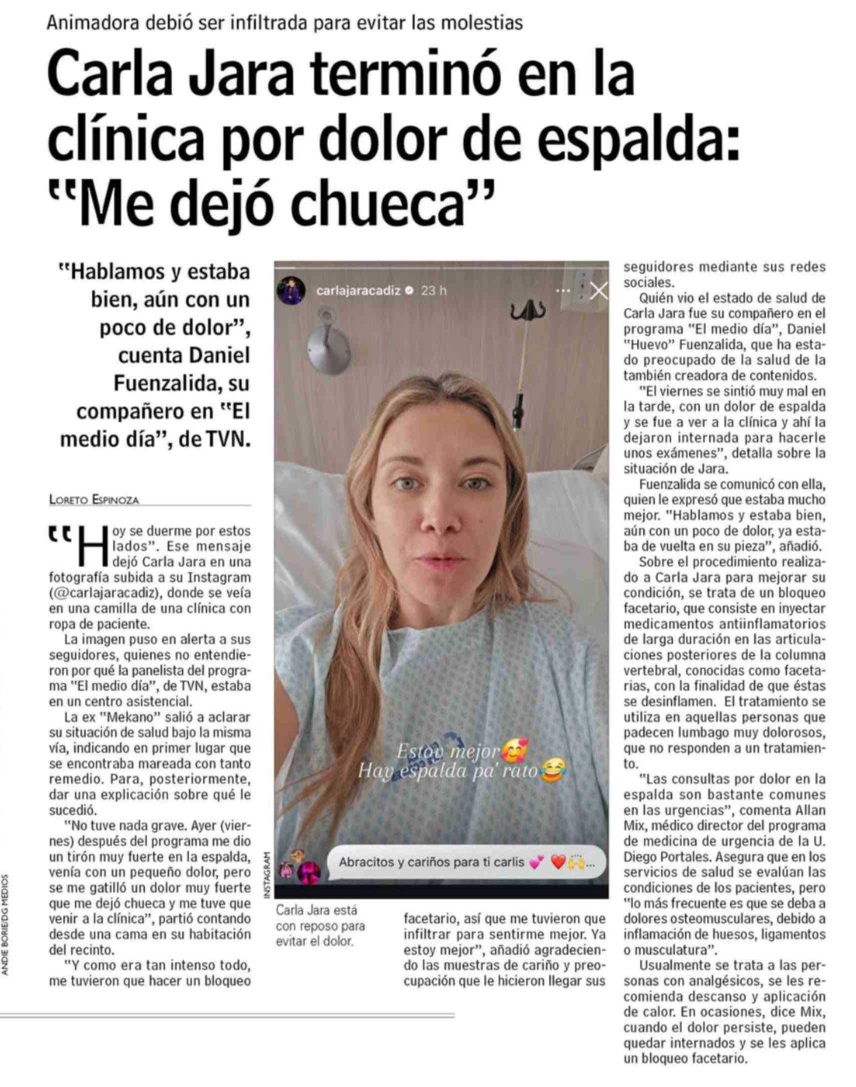 Carla Jara terminó en la clínica por dolor de espalda: “Me dejó chueca”