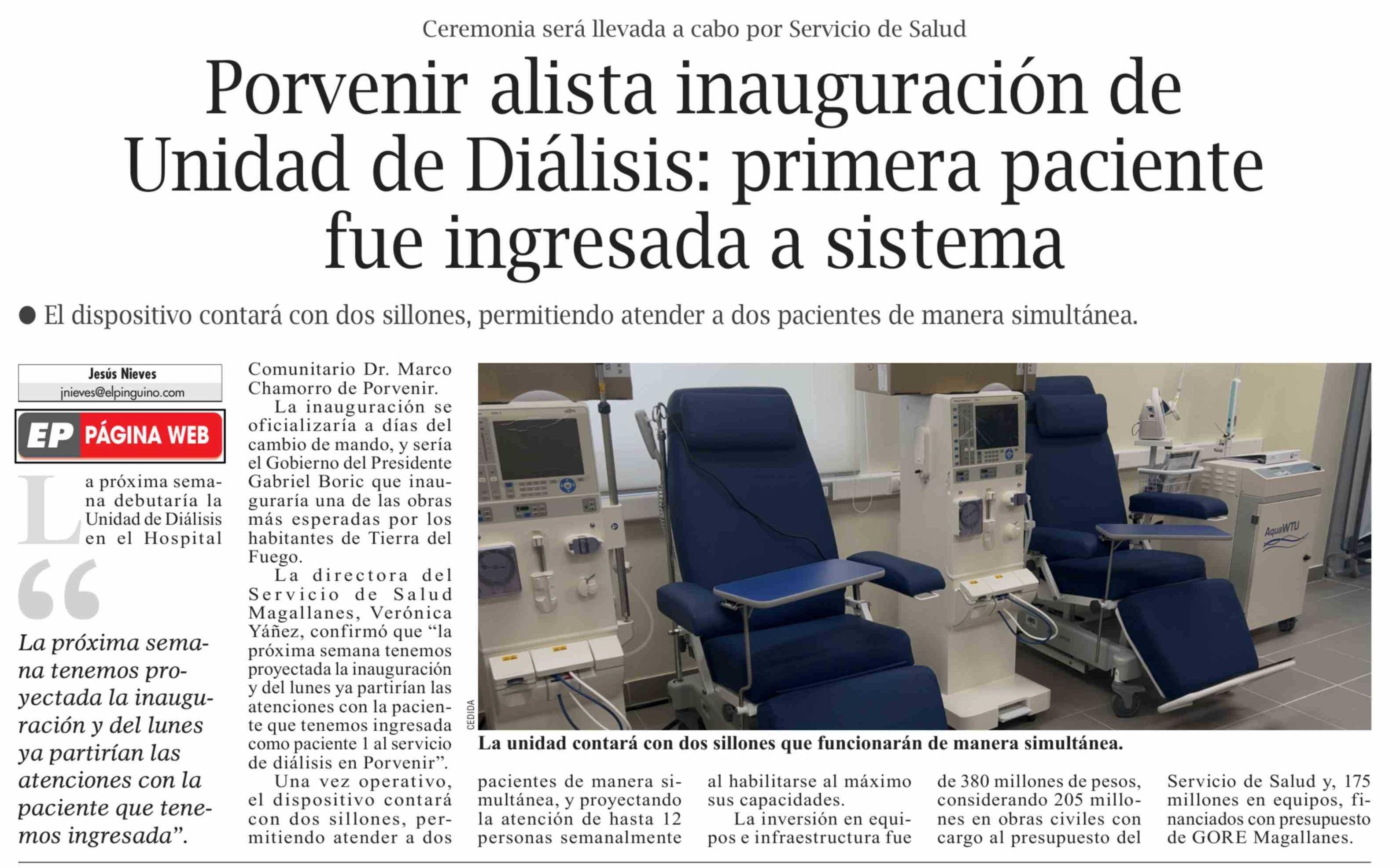 Título: Porvenir alista inauguración de Unidad de Diálisis: primera paciente fue ingresada a sistema