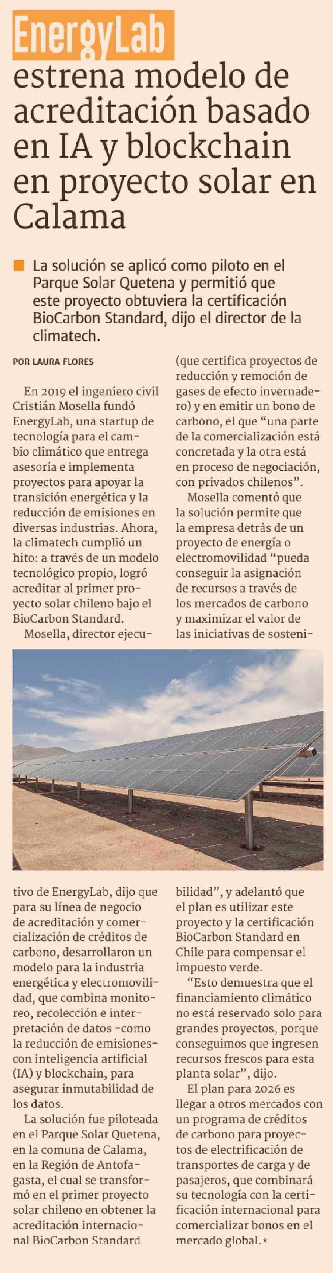 Título: EnergyLab estrena modelo de acreditación basado en IA y blockchain en proyecto solar en Calama