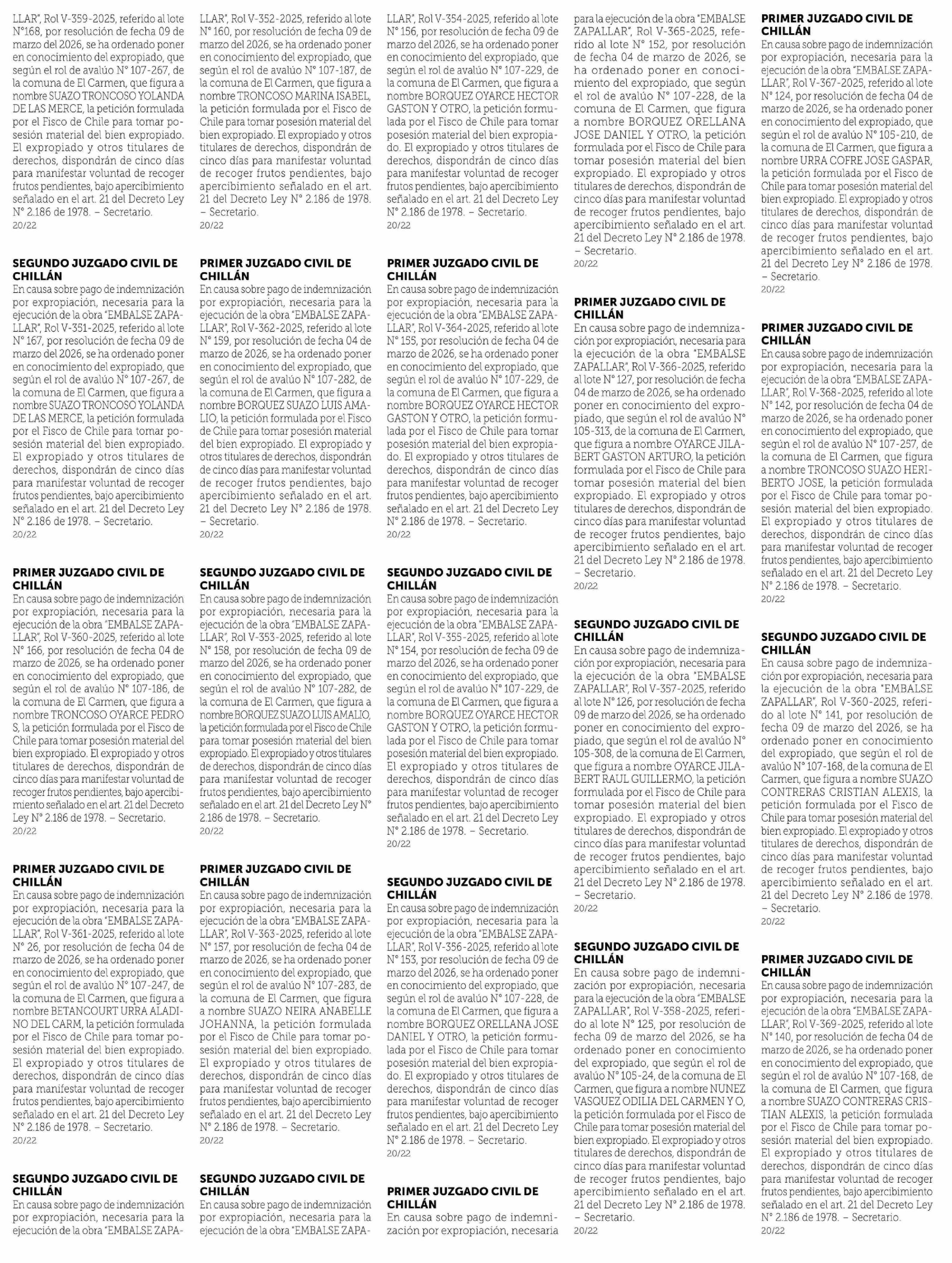 | Título: | SEGUNDO JUZGADO CIVIL DE CHILLÁN En causa sobre pago de indemnización por expropiación, necesaria para la ejecución de la obra "EMBALSE ZAPALLAR", Rol V-351-2025, referido al lote Nº 167, por resolución de fecha 09 de marzo del 2026, se ha ordenado poner en conocimiento del expropiado, que según el |
