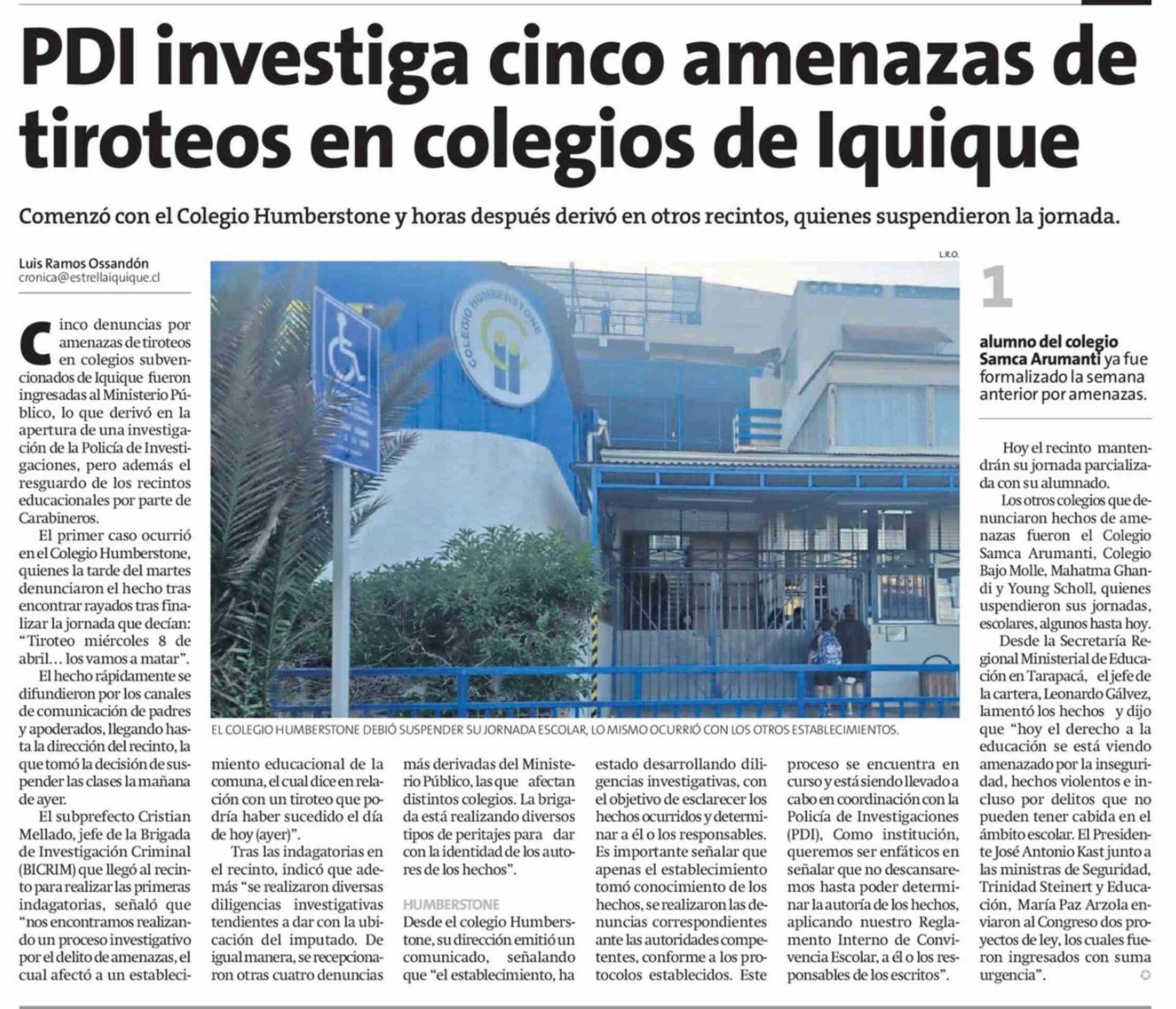 PDI investiga cinco amenazas de tiroteos en colegios de Iquique