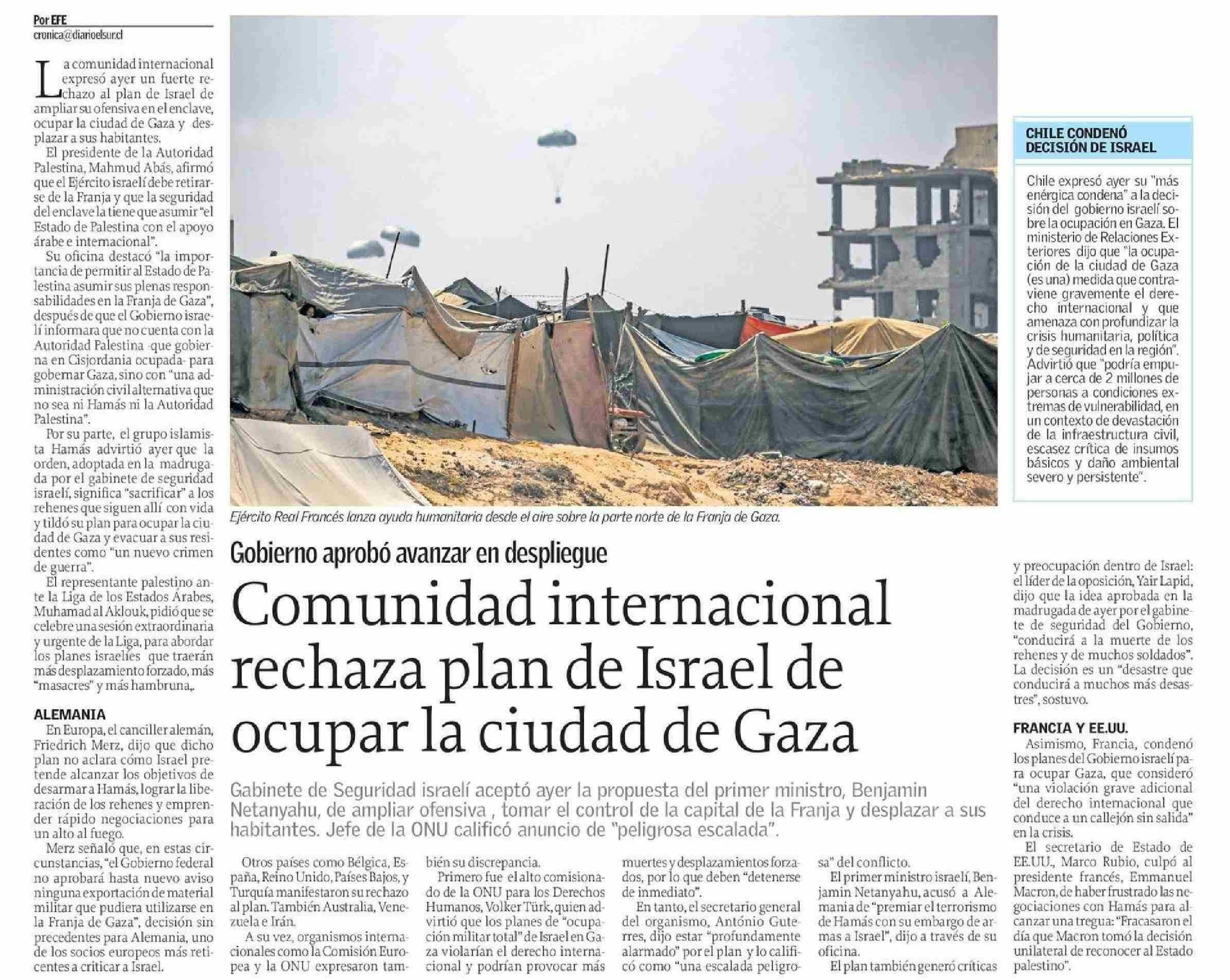 Comunidad internacional rechaza plan de Israel de ocupar la ciudad de Gaza