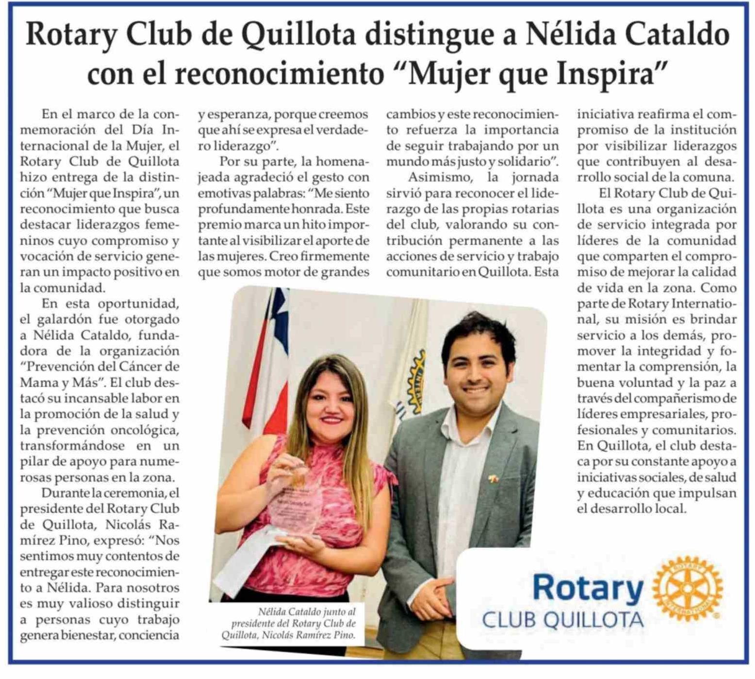 Rotary Club de Quillota distingue a Nélida Cataldo con el reconocimiento "Mujer que Inspira"