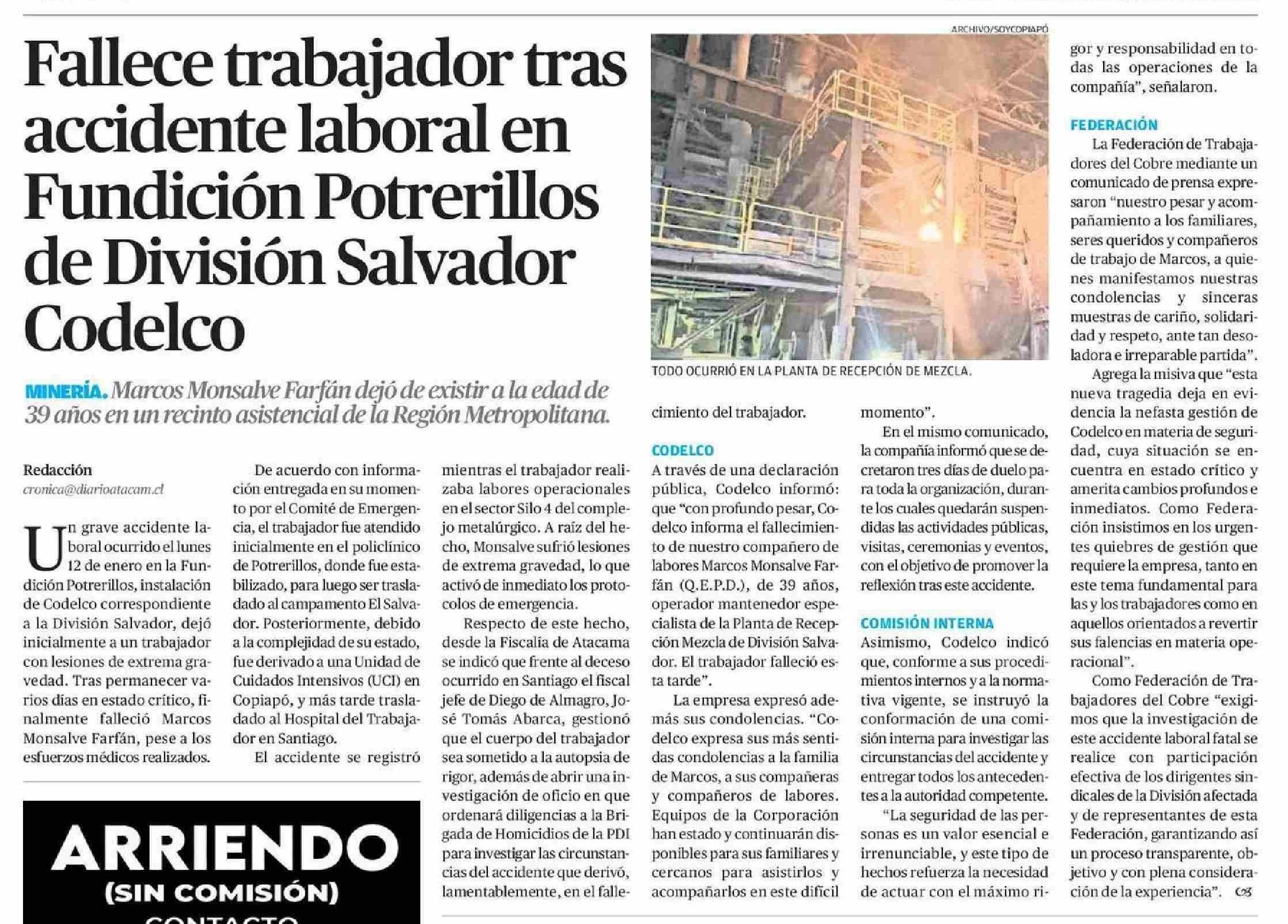Fallece trabajador tras accidente laboral en Fundición Potrerillos de División Salvador Codelco