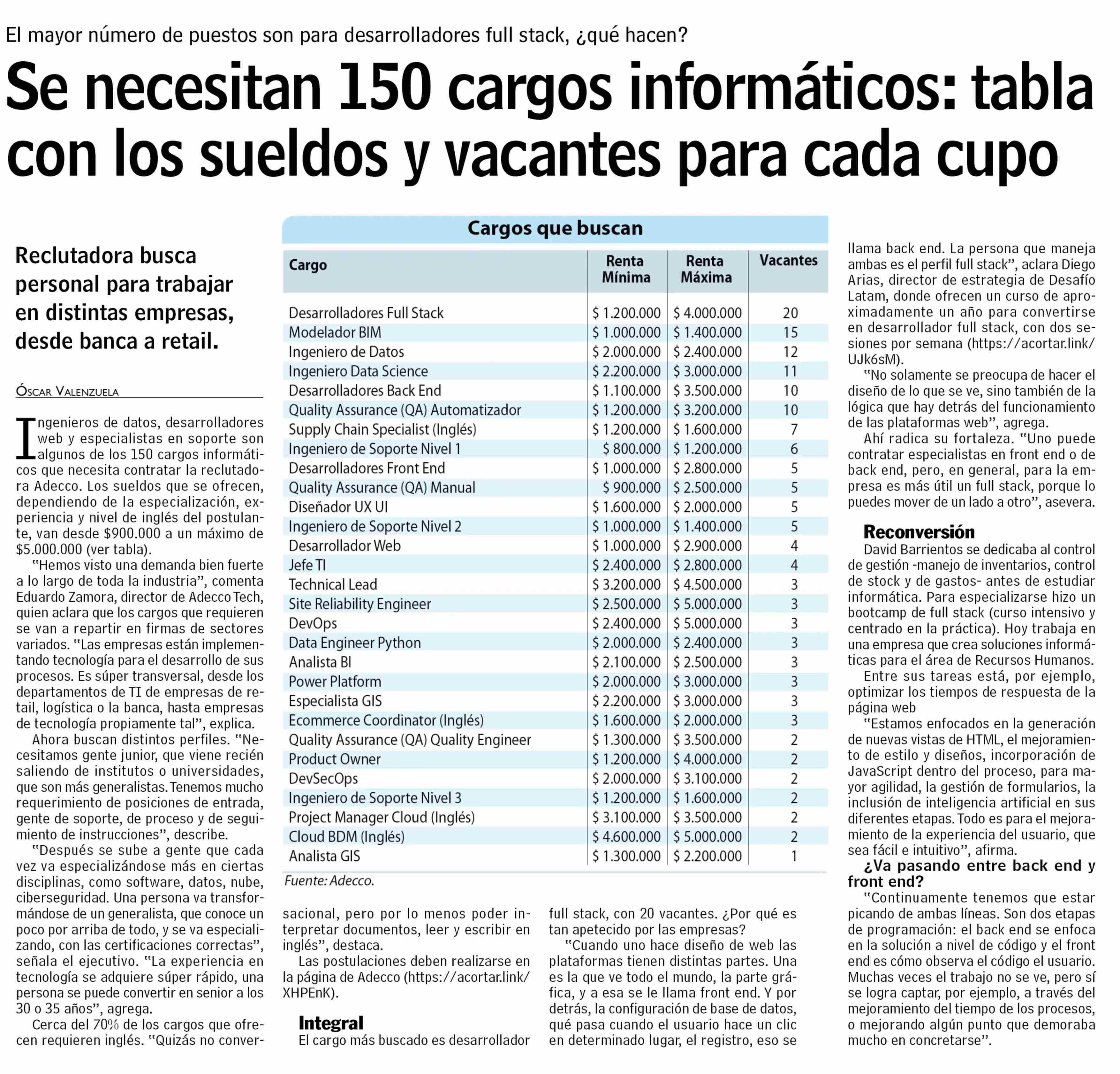 Se necesitan 150 cargos informáticos: tabla con los sueldos y vacantes para cada cupo
