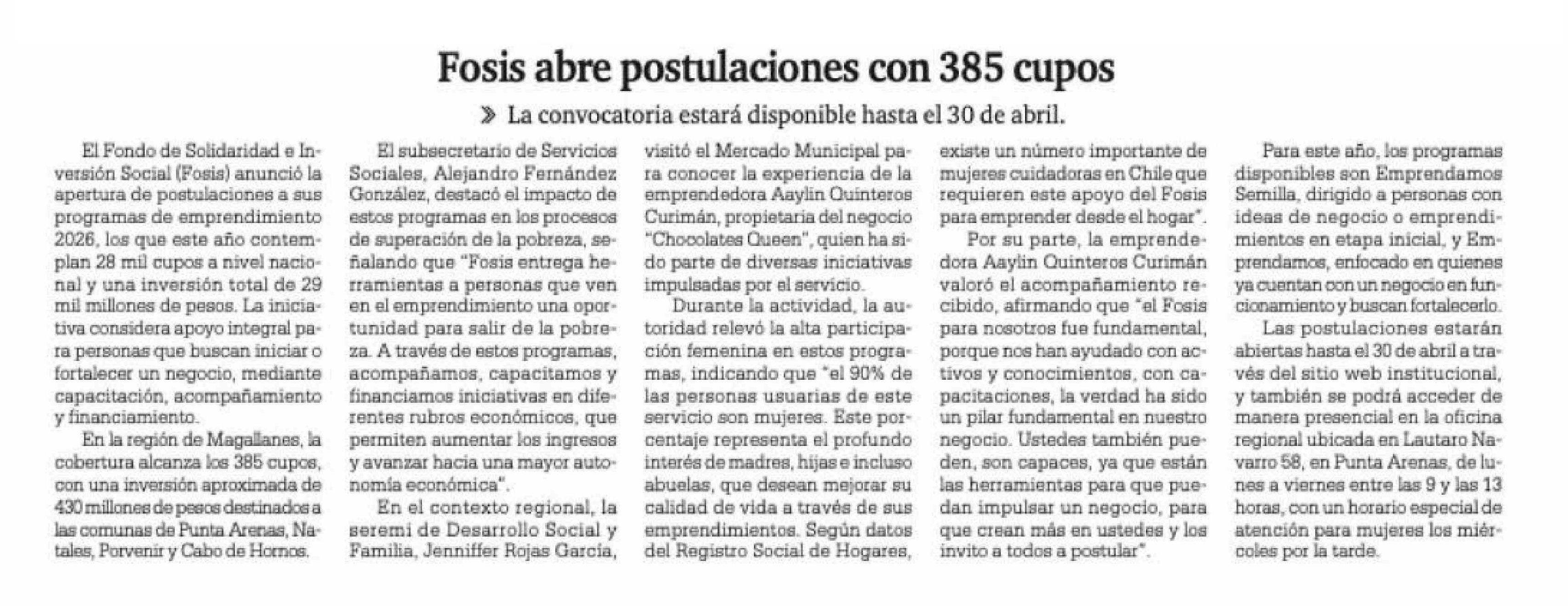 Fosis abre postulaciones con 385 cupos