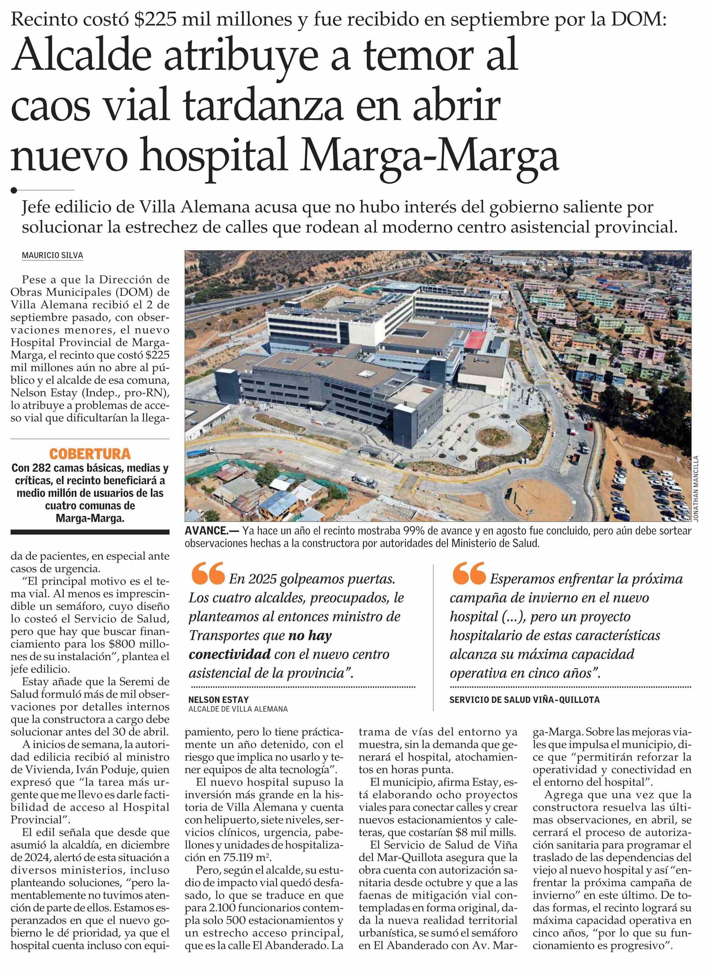 Alcalde atribuye a temor al caos vial tardanza en abrir nuevo hospital Marga-Marga