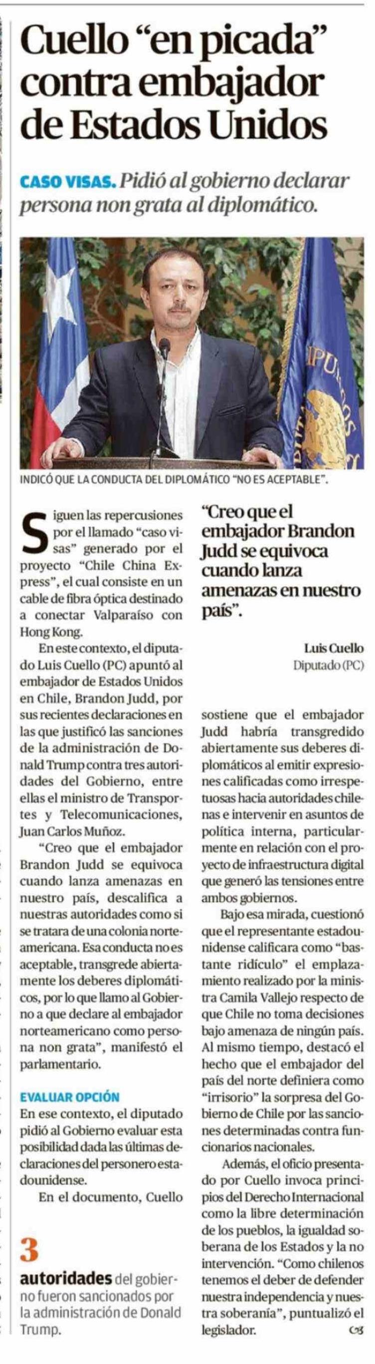 Cuello "en picada" contra embajador de Estados Unidos