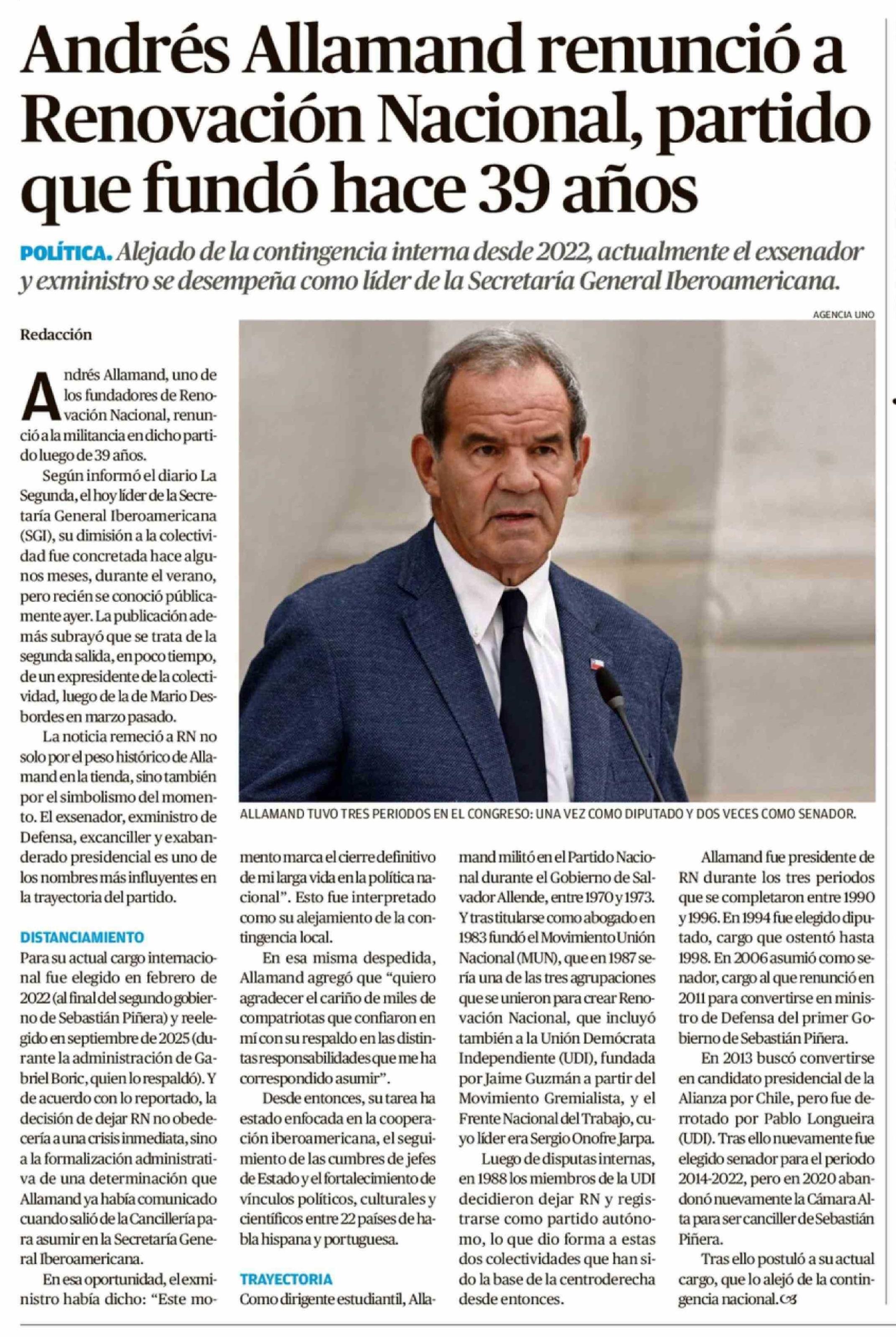 Andrés Allamand renunció a Renovación Nacional, partido que fundó hace 39 años