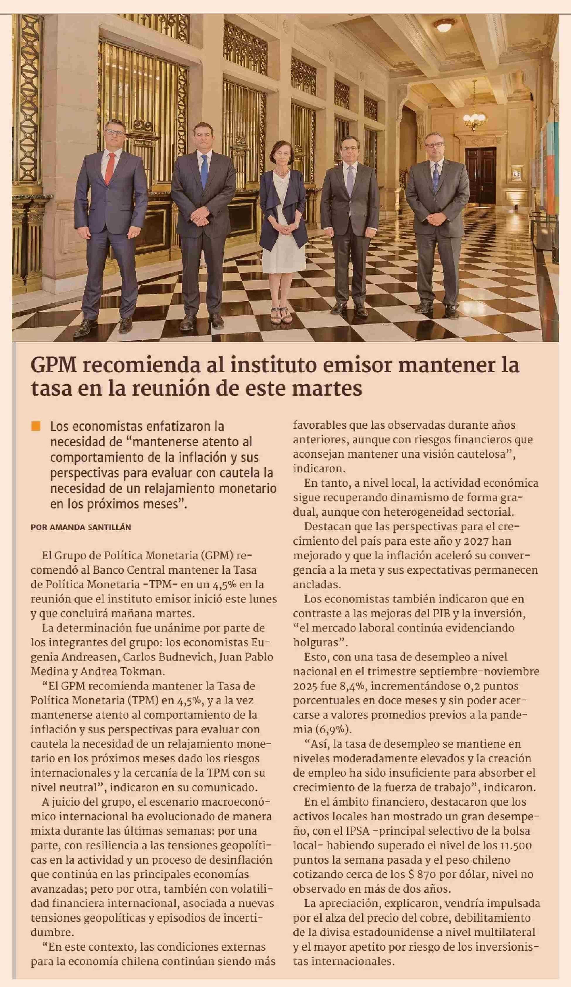 GPM recomienda al instituto emisor mantener la tasa en la reunión de este martes