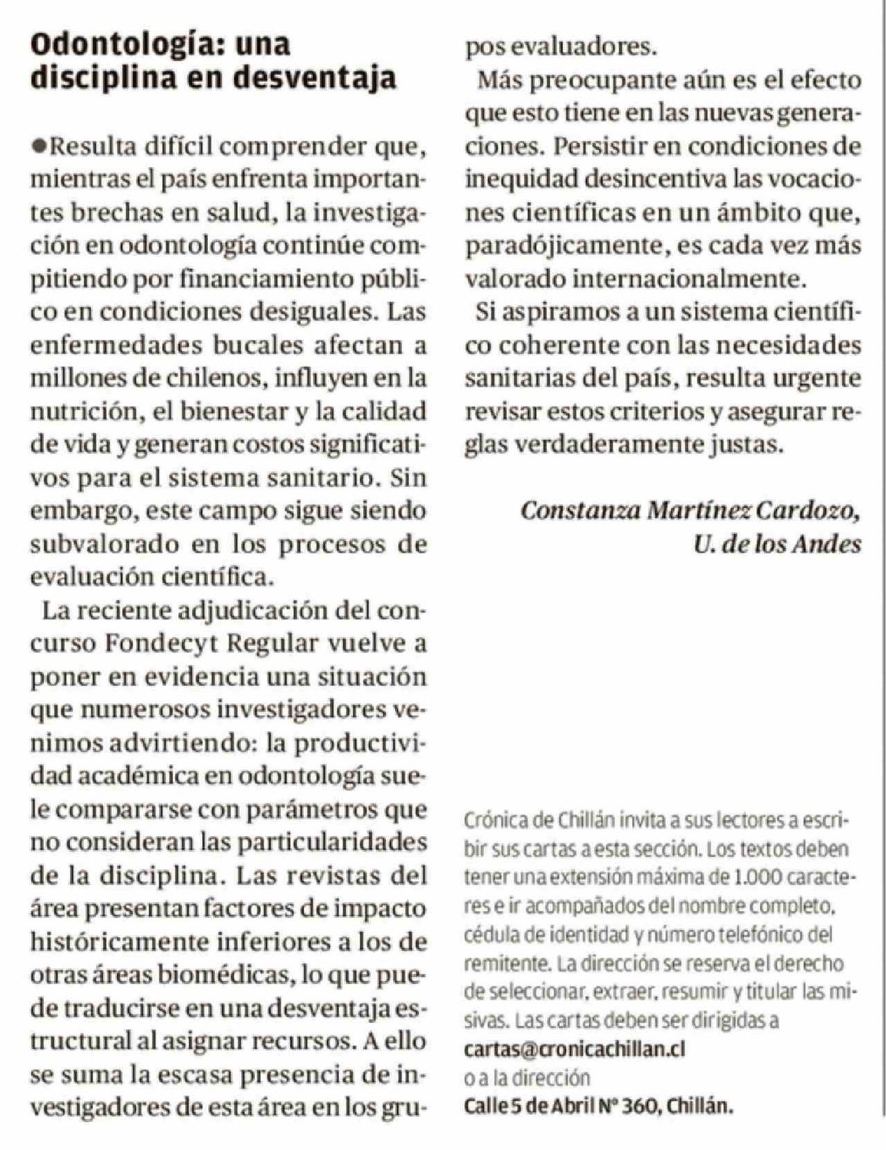 Cartas: Odontología: una disciplina en desventaja