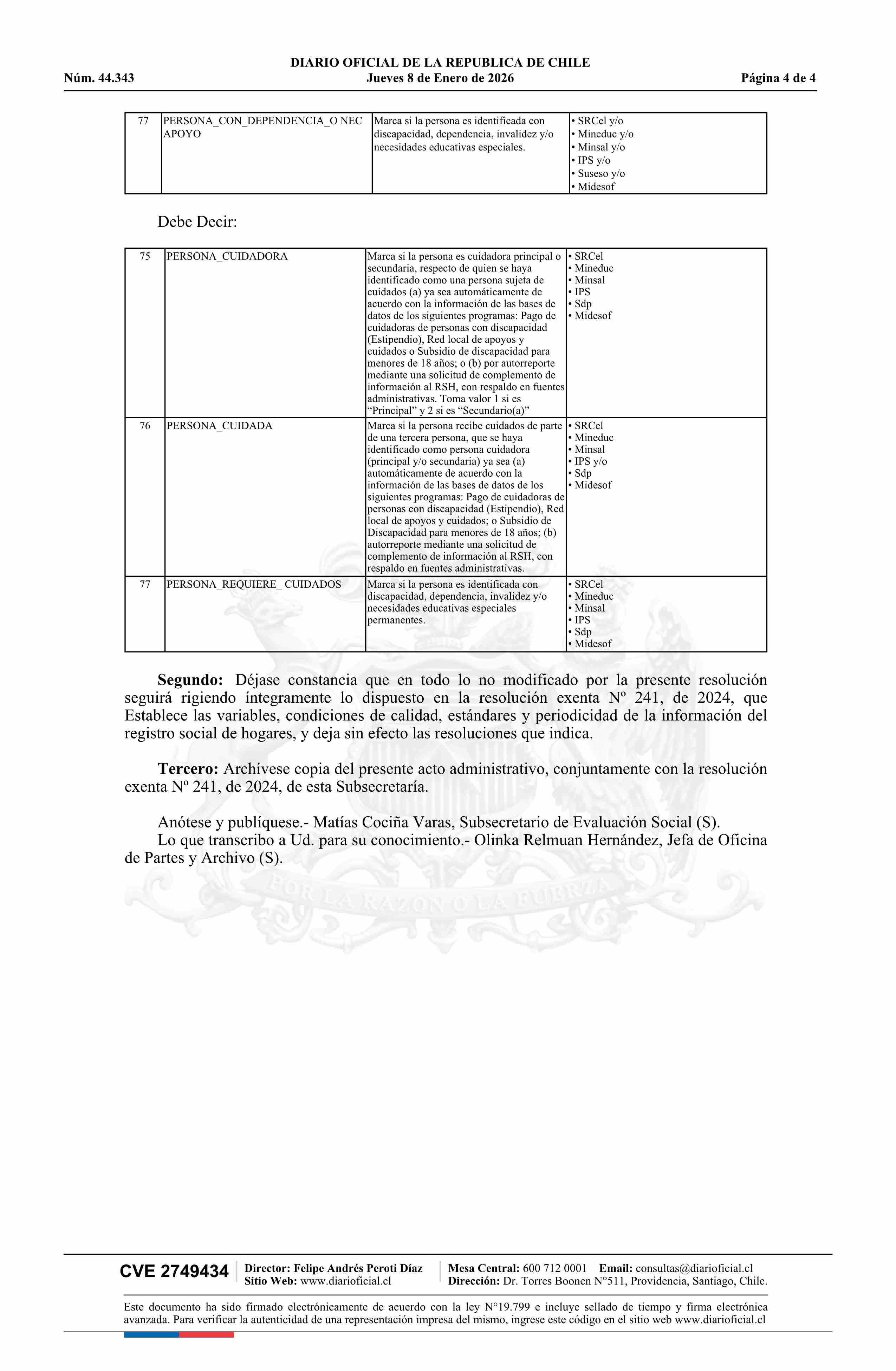 Título: Resolución exenta número 245, de 2025.- Modifica resolución Nº 241 exenta, que establece las variables, condiciones de calidad, estándares y periodicidad de la información del Registro Social de Hogares, y deja sin efecto resoluciones que indica