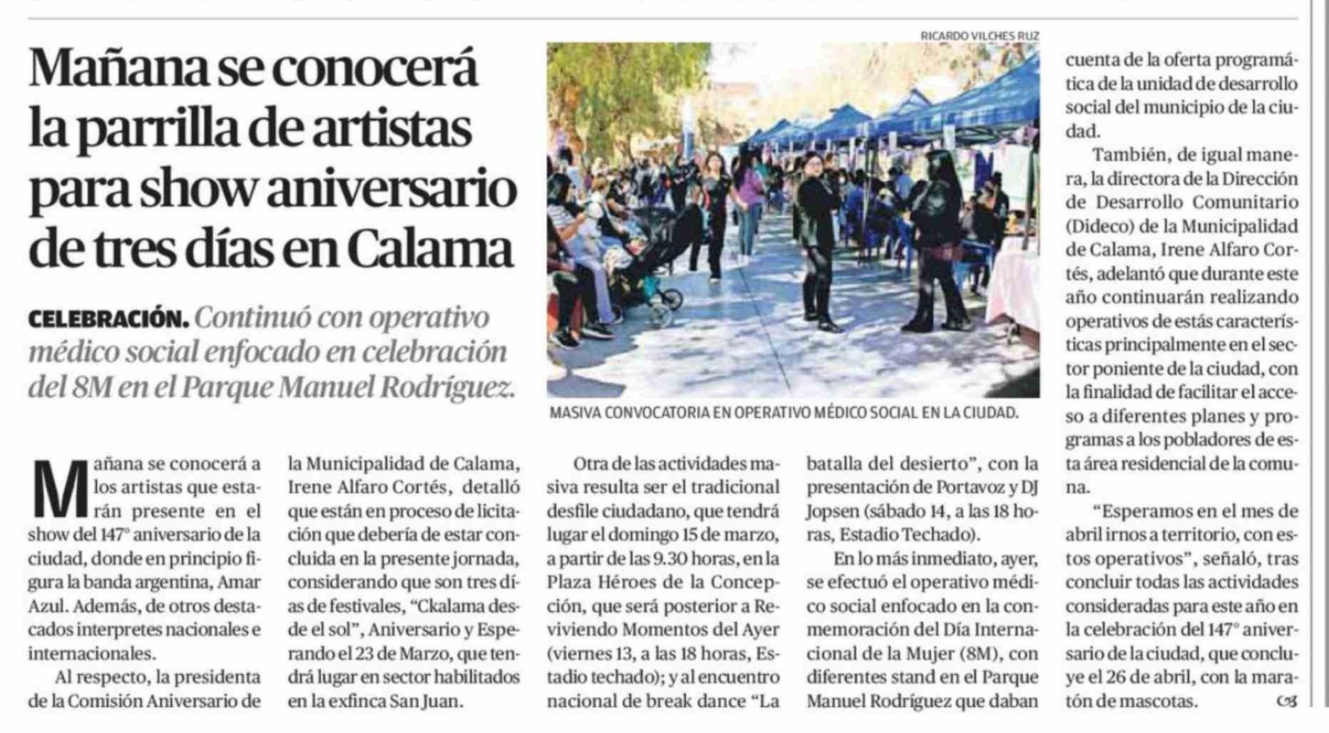 Mañana se conocerá la parrilla de artistas para show aniversario de tres días en Calama