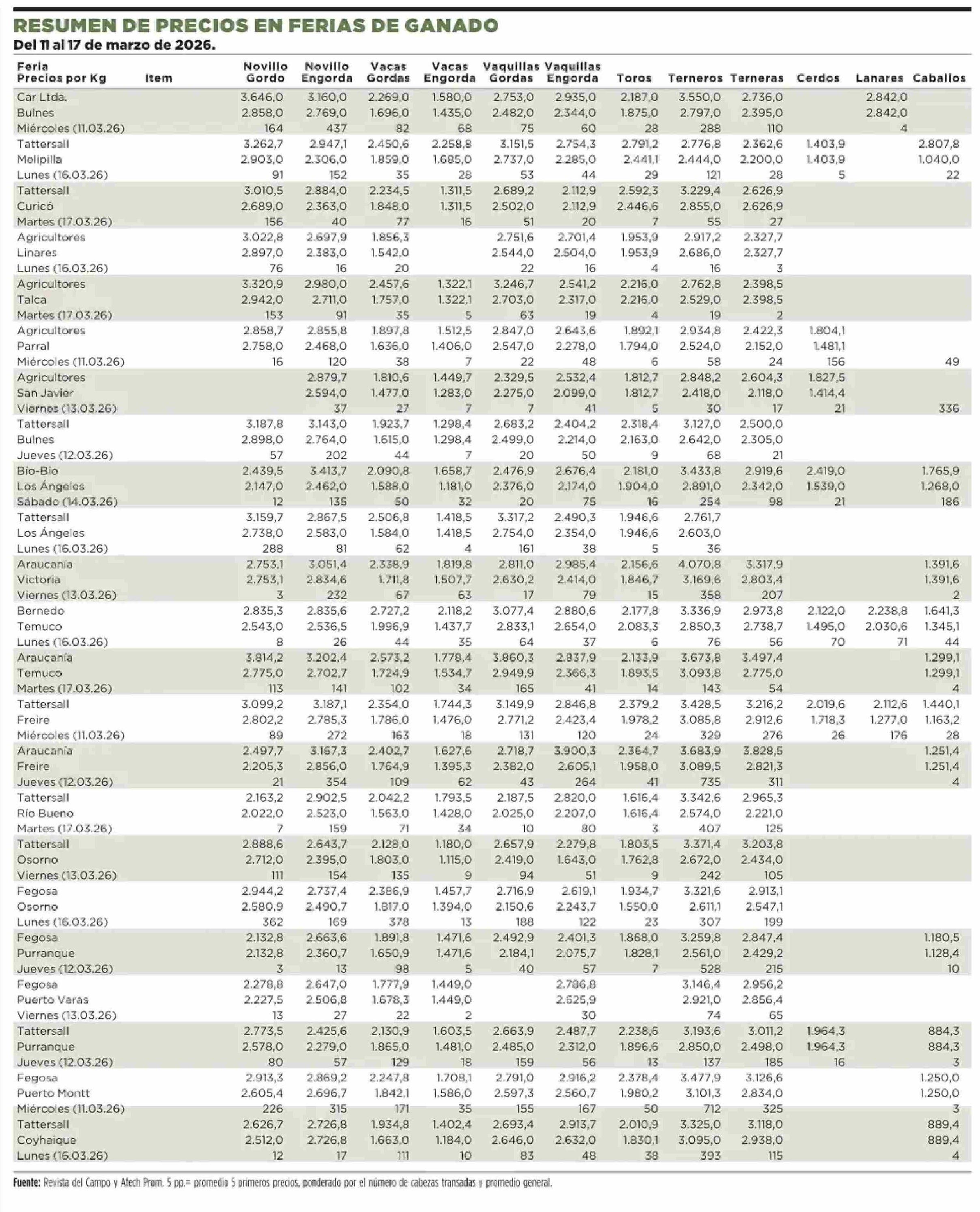 Título: RESUMEN DE PRECIOS EN FERIAS DE GANADO Del Tl al 17 de marzo de 2026. Forla Precios porKg CarLtda. Bulnes Miércoles (11.03.26) Tattorsall Melipilla Lunes (16.03.26) Tattersall Curicó Martes (17.03.26) Agricultores Linares Lunes (16.03.26) Agricultores Talca Martos (17.03.26) Agricultores Parral Miér