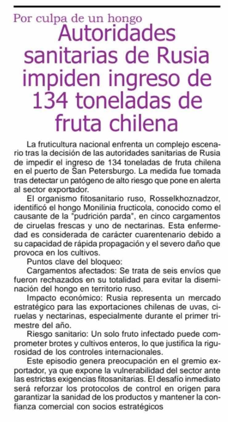 Por culpa de un hongo Autoridades sanitarias de Rusia impiden ingreso de 134 toneladas de fruta chilena