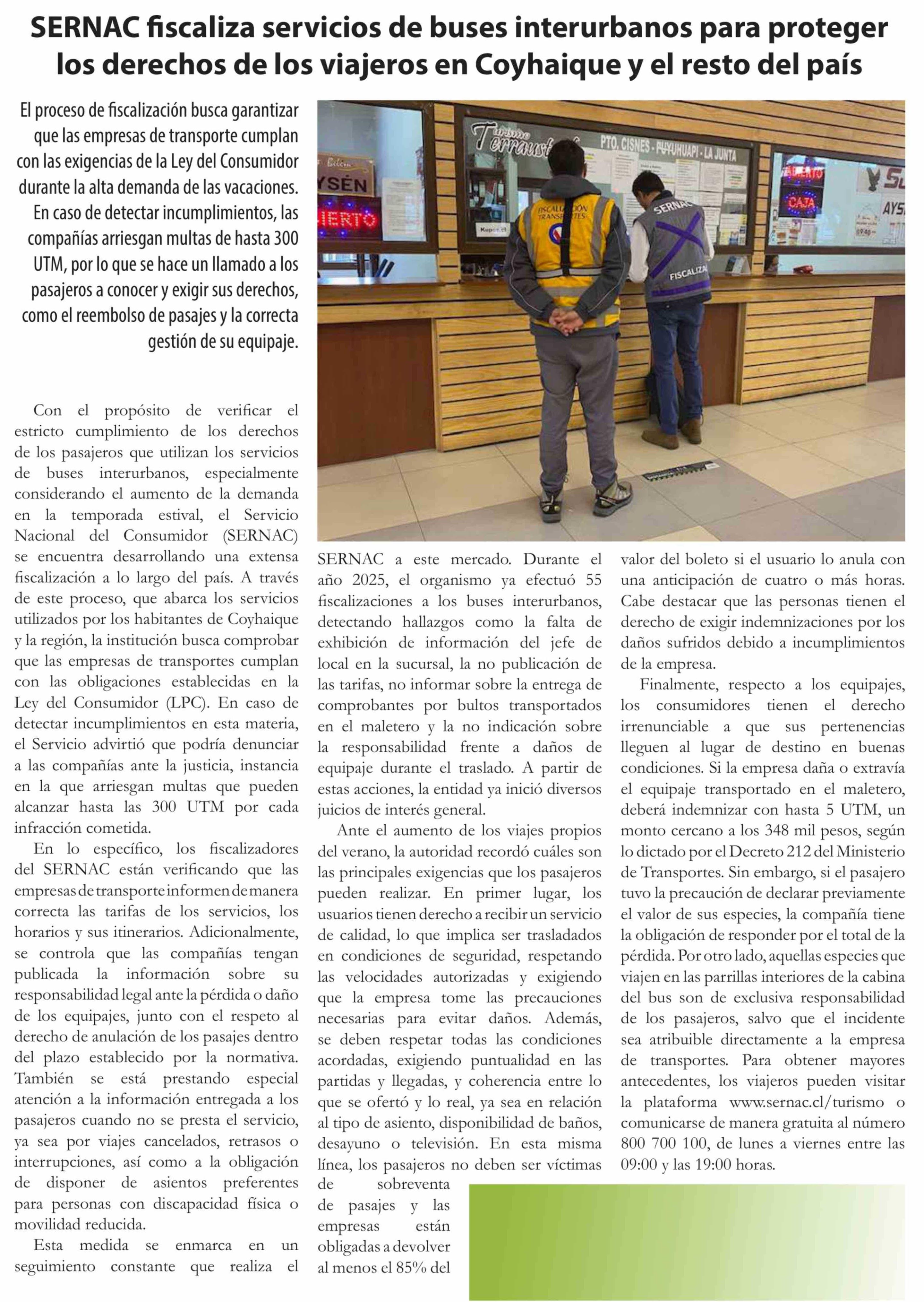 SERNAC fiscaliza servicios de buses interurbanos para proteger los derechos de los viajeros en Coyhaique y el resto del país