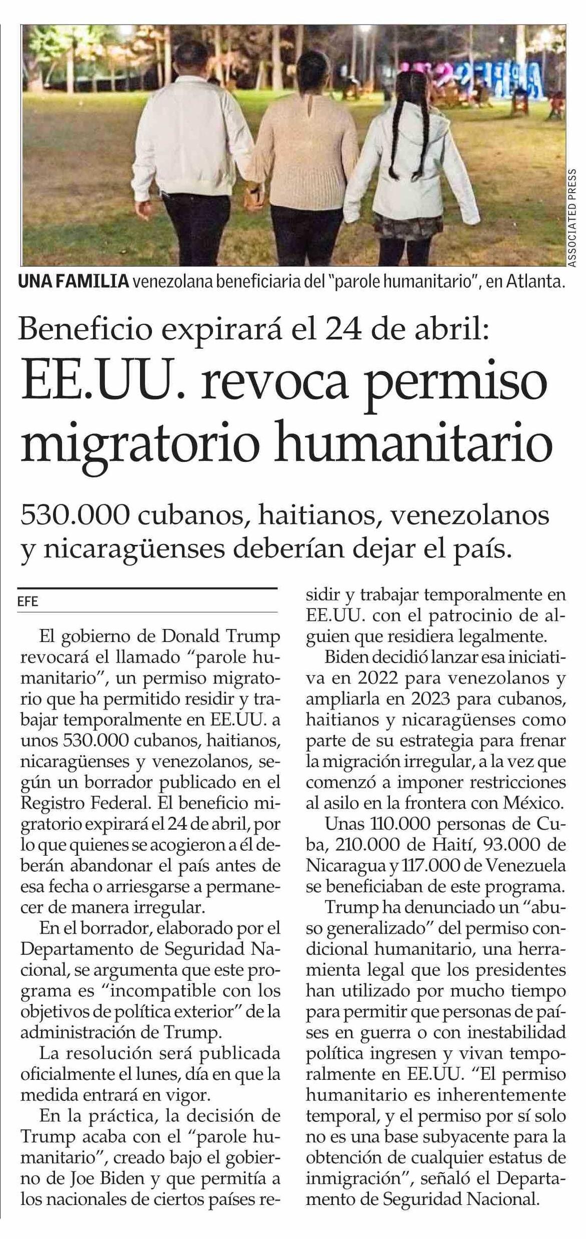 EE.UU. revoca permiso migratorio humanitario