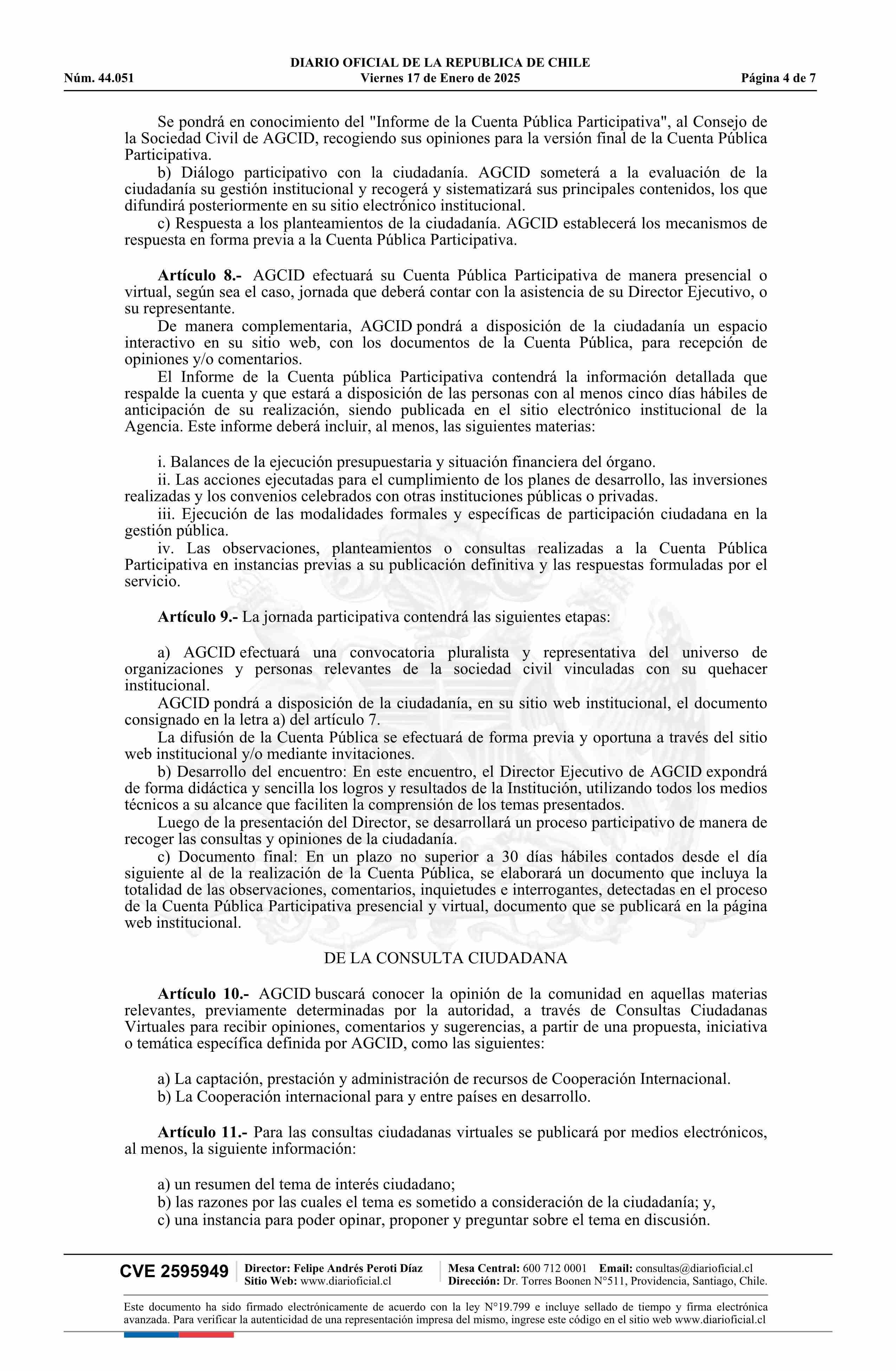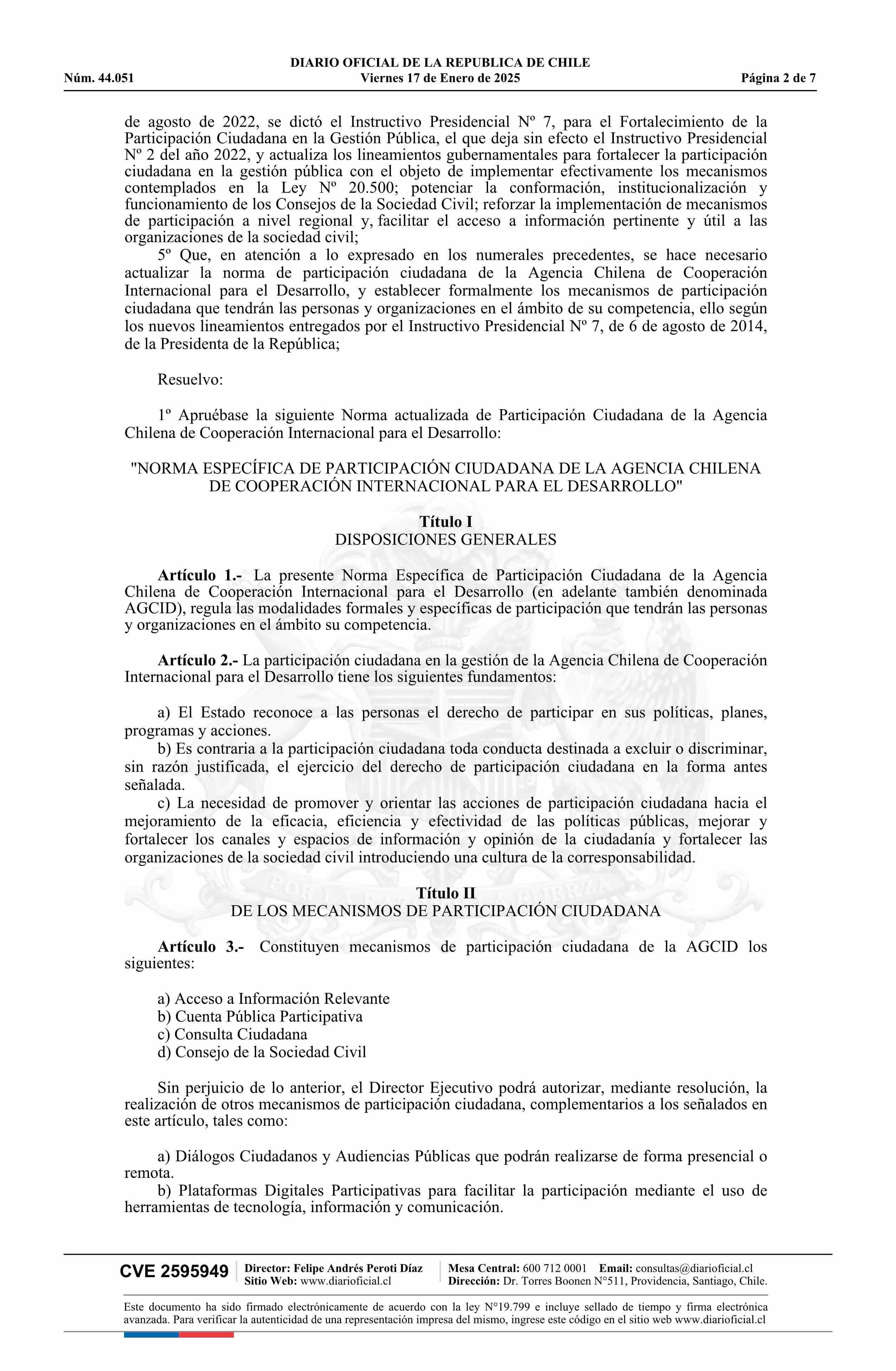 | Título: | Resolución exenta número 487, de 2024.- Aprueba actualización de la norma de participación ciudadana de la Agencia Chilena de Cooperación Internacional para el Desarrollo |