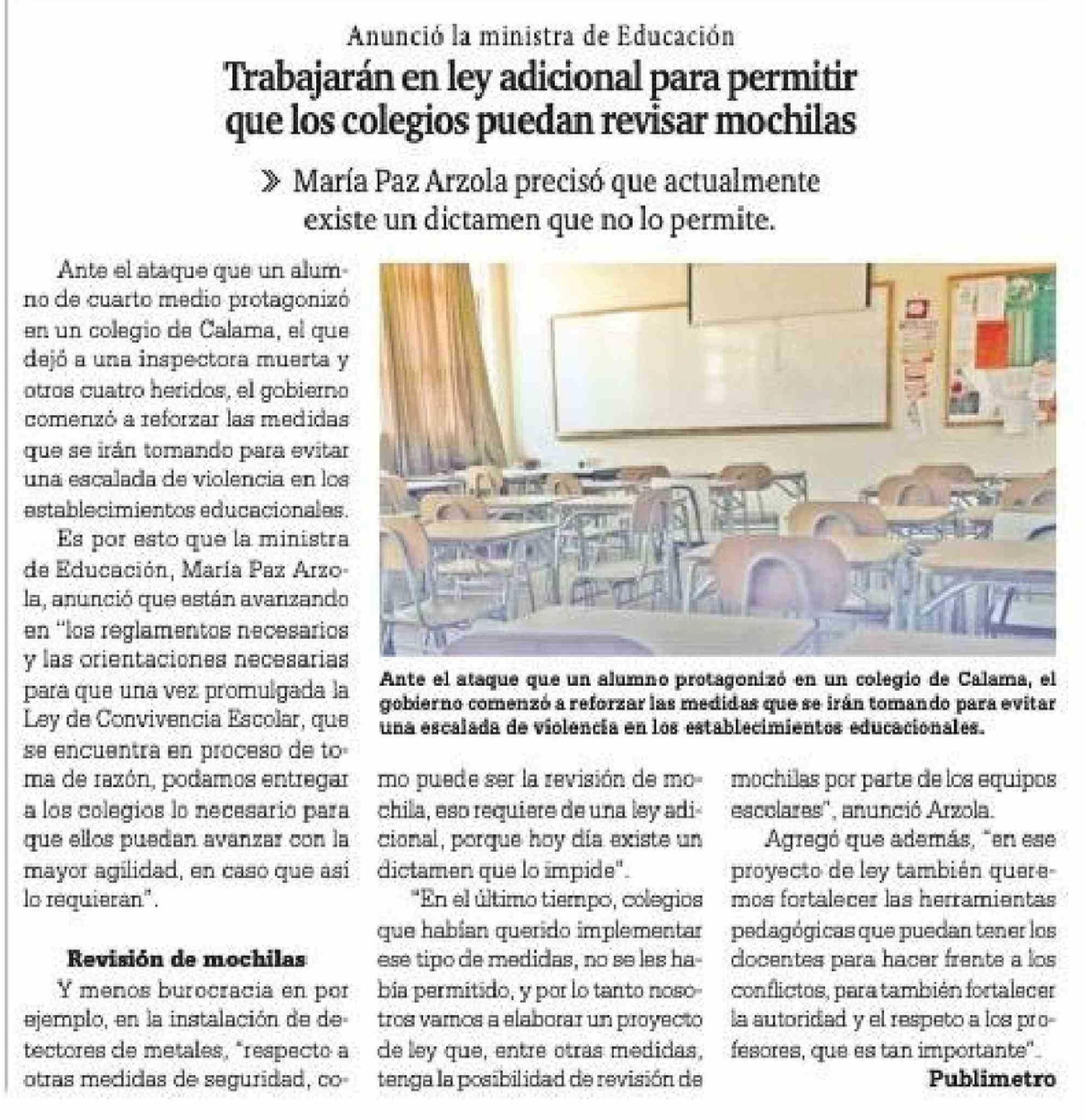 Trabajarán en ley adicional para permitir que los colegios puedan revisar mochilas