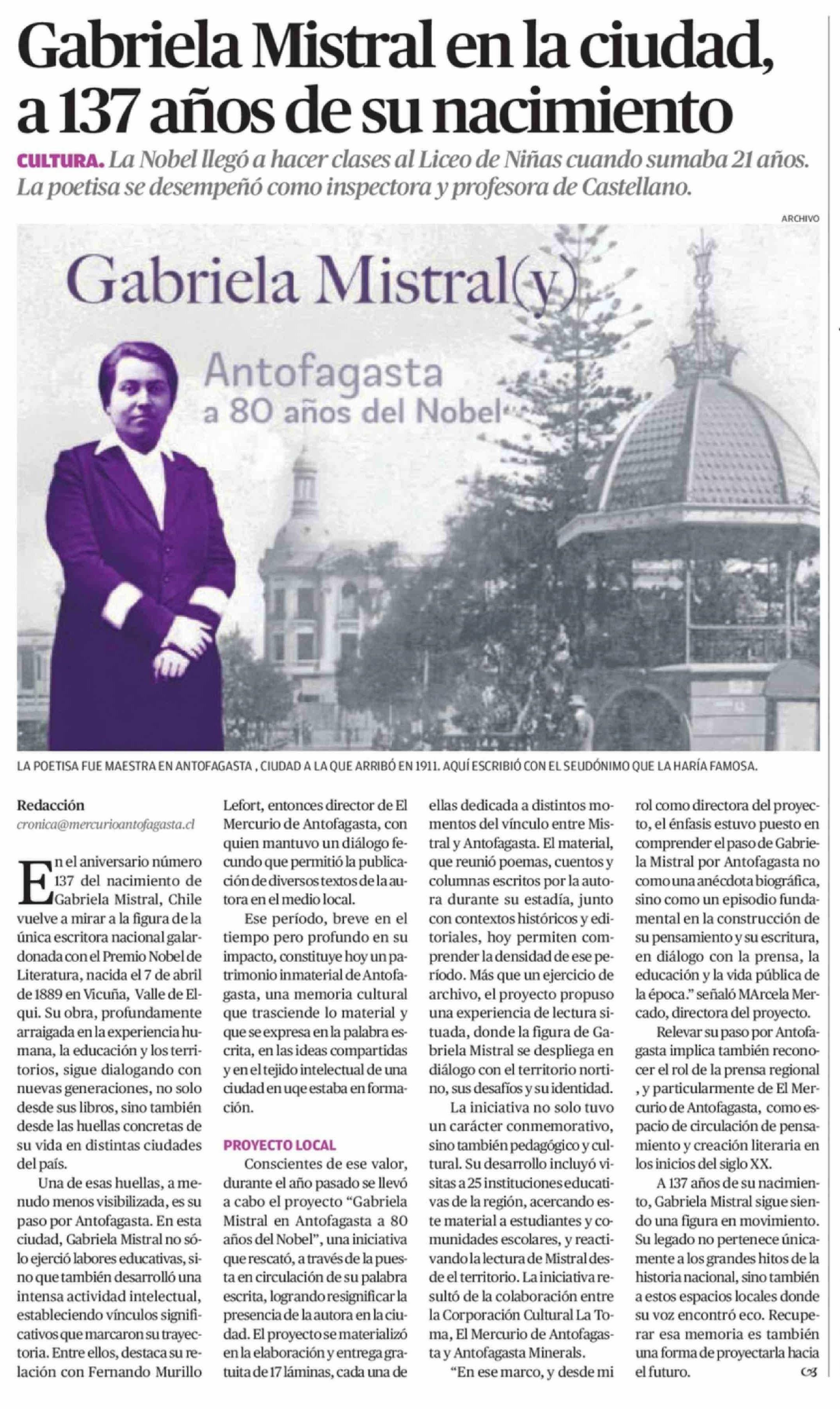 Gabriela Mistral en la ciudad, a 137 años de su nacimiento