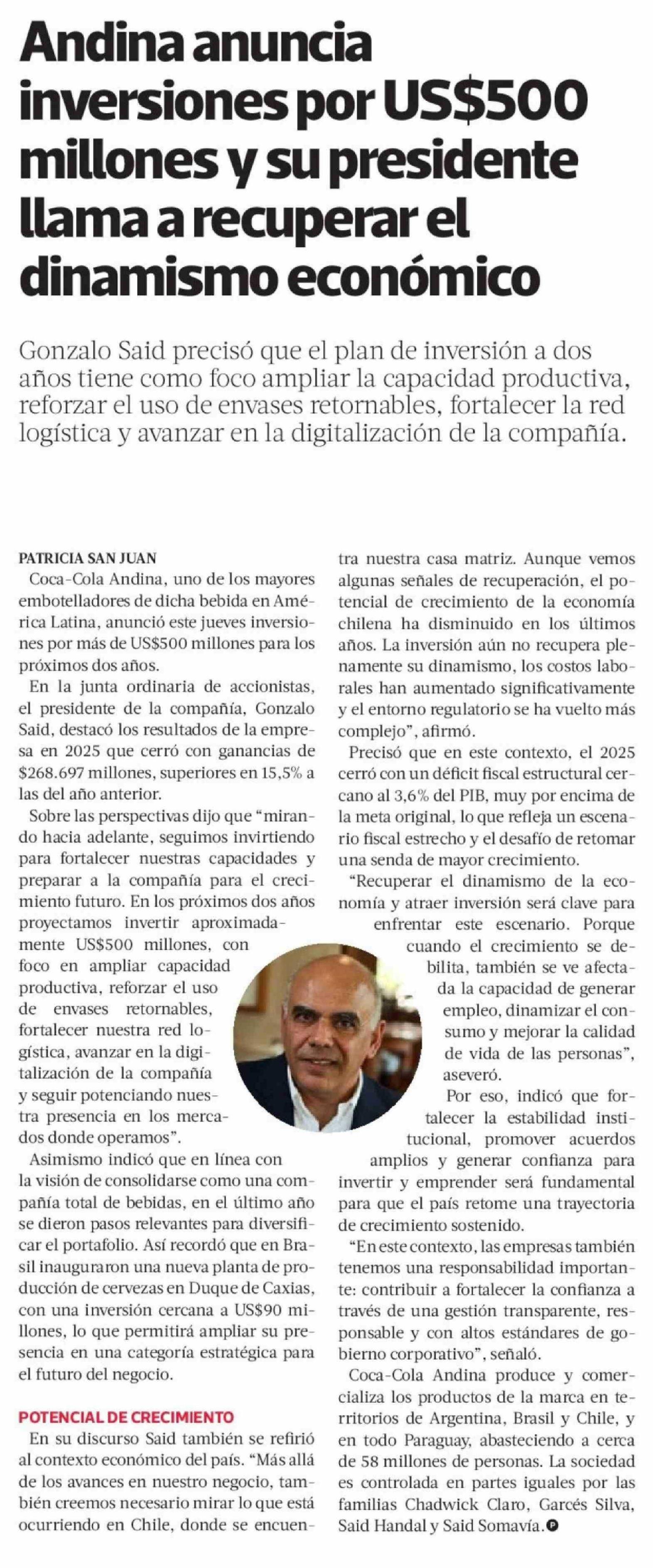 Título: Andina anuncia inversiones por US$500 millones y su presidente llama a recuperar el dinamismo económico