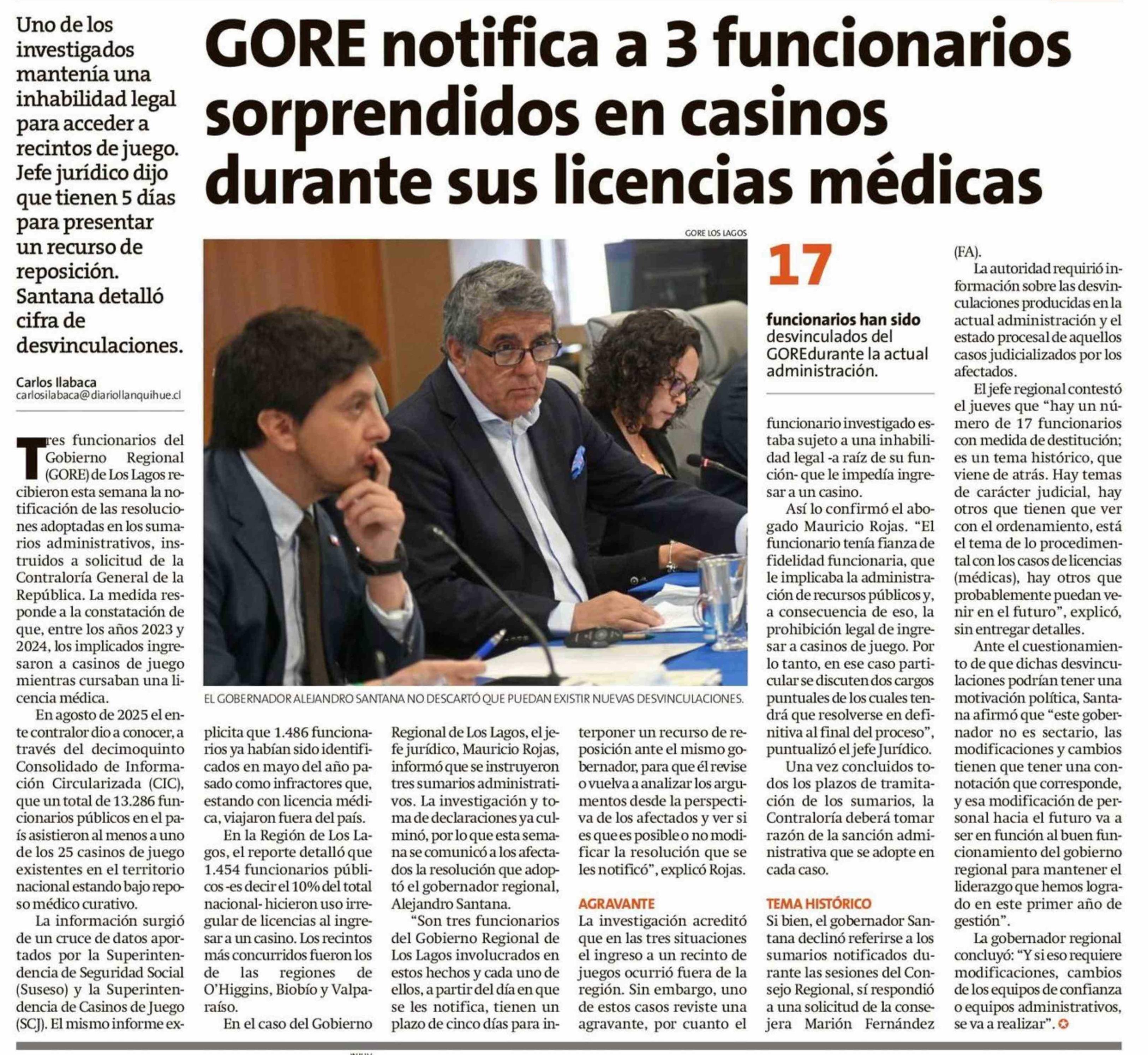 GORE notifica a 3 funcionarios sorprendidos en casinos durante sus licencias médicas
