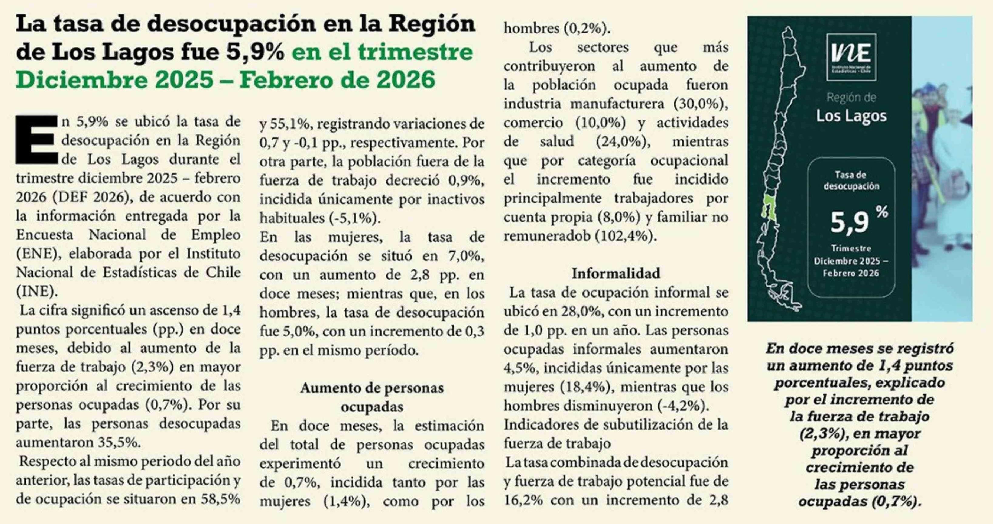 La tasa de desocupación en la Región de Los Lagos fue 5,9% en el trimestre Diciembre 2025 - Febrero de 2026