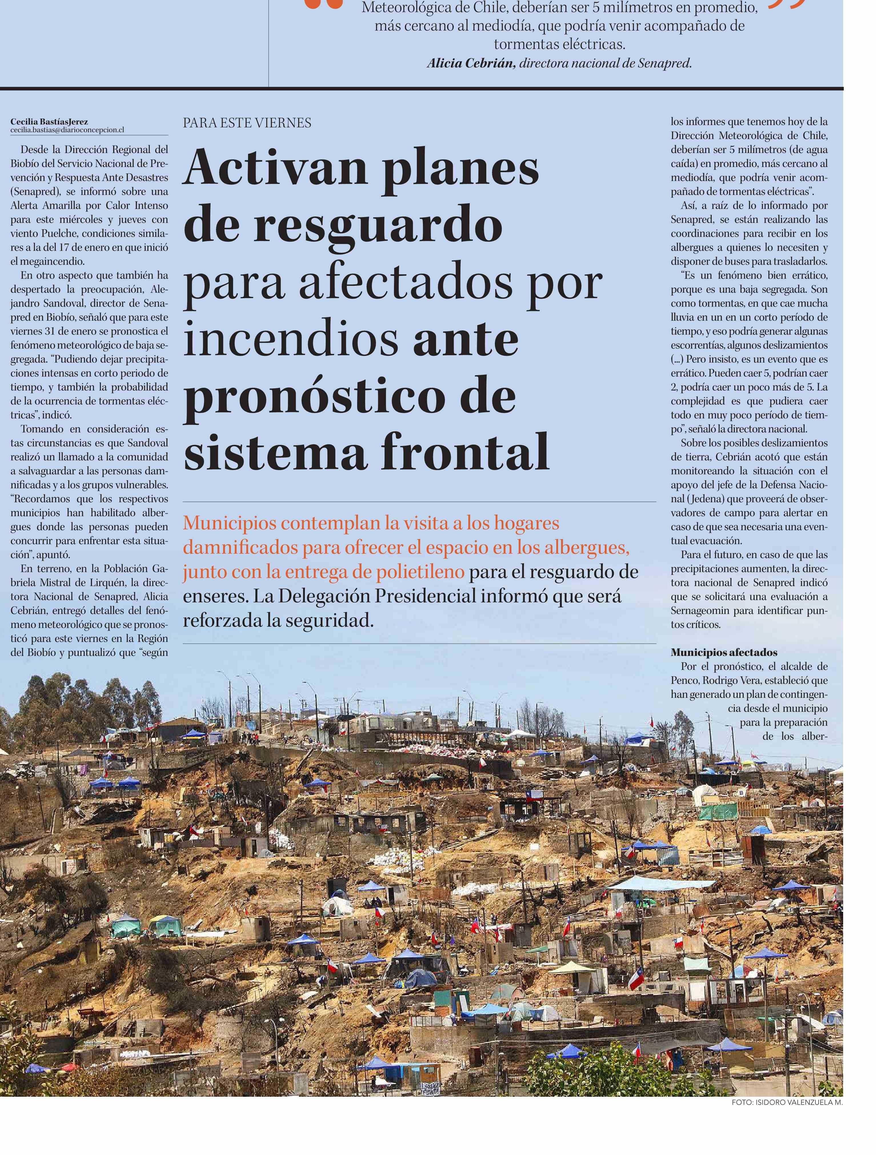 Activan planes de resguardo para afectados por incendios ante pronóstico de sistema frontal