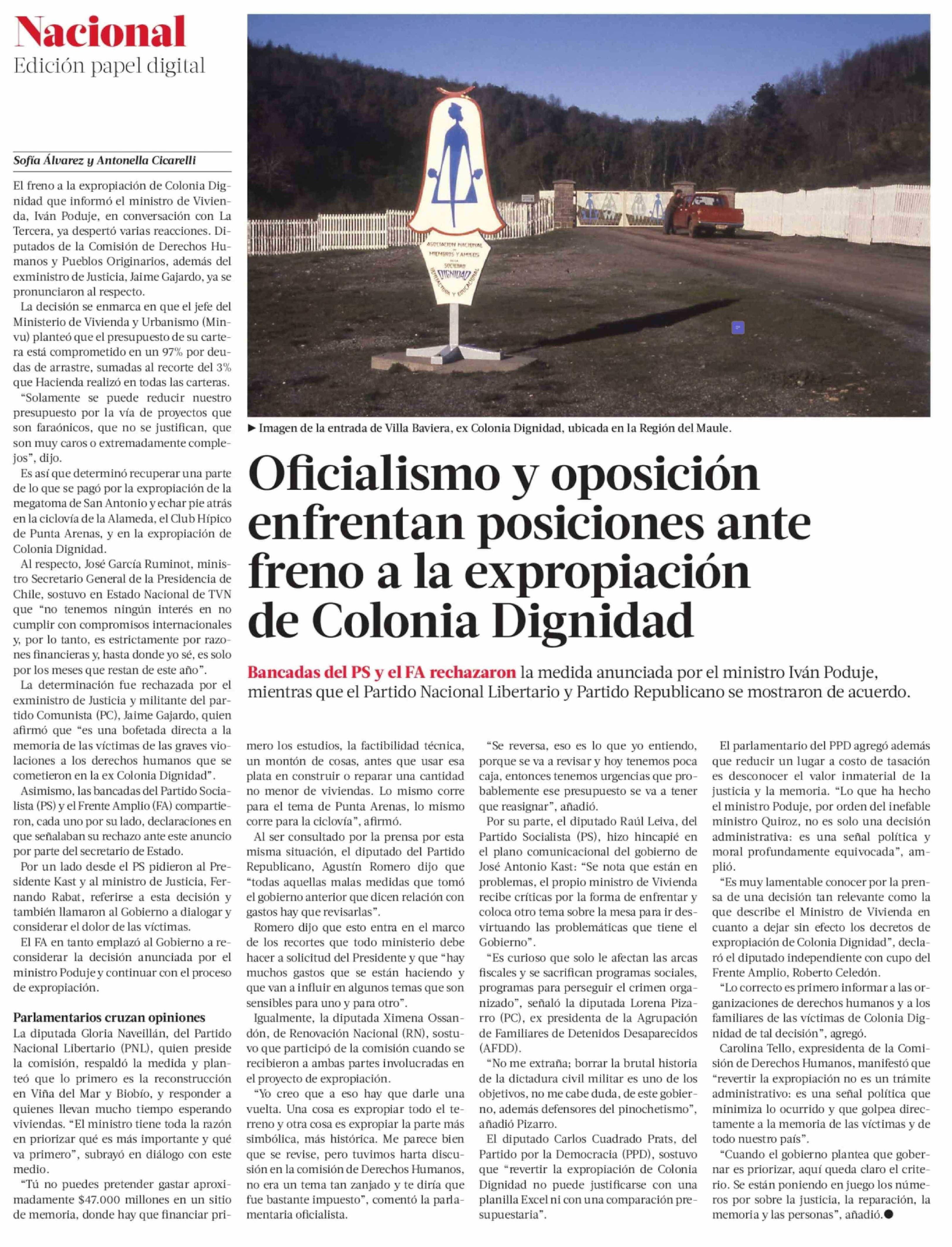 Título: Oficialismo y oposición enfrentan posiciones ante freno a la expropiación de Colonia Dignidad