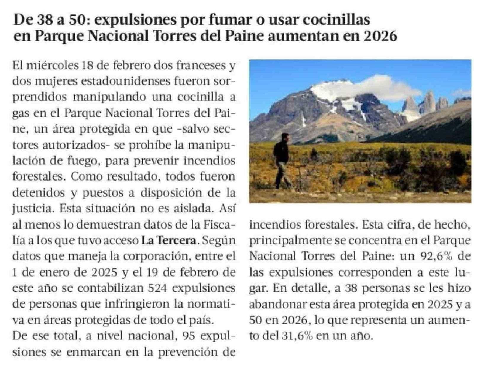 De 38 a 50: expulsiones por fumar o usar cocinillas en Parque Nacional Torres del Paine aumentan en 2026